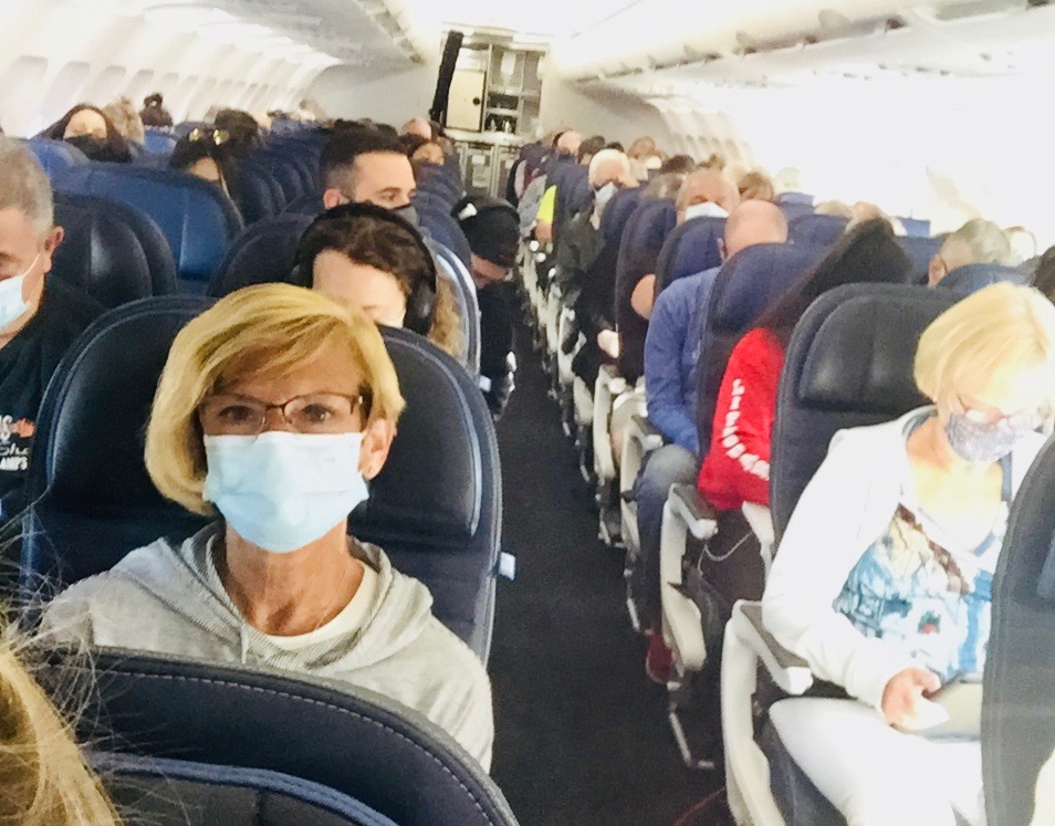 No fights on our plane, just cooperative masked folks (hard to be sneaky). Masks, but no distancing.