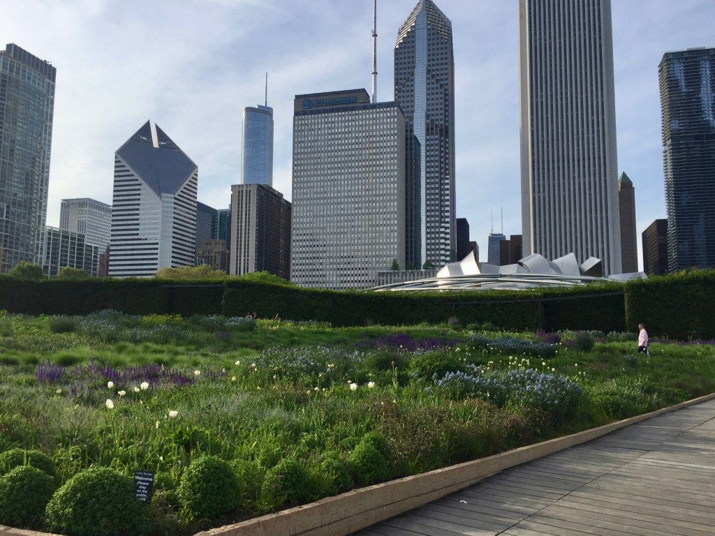 The Lurie botanical gardens, by the Art Institute. You can see the top of the Frank Gehry-designed Pritzker bandshell and bunches of buildings I can’t identify.