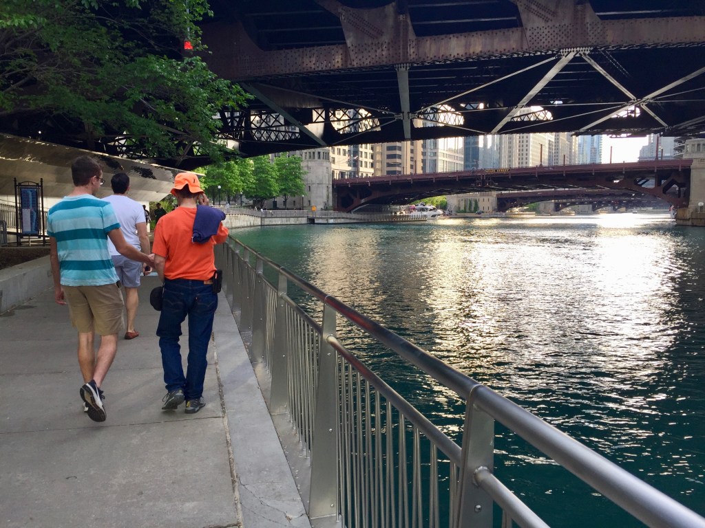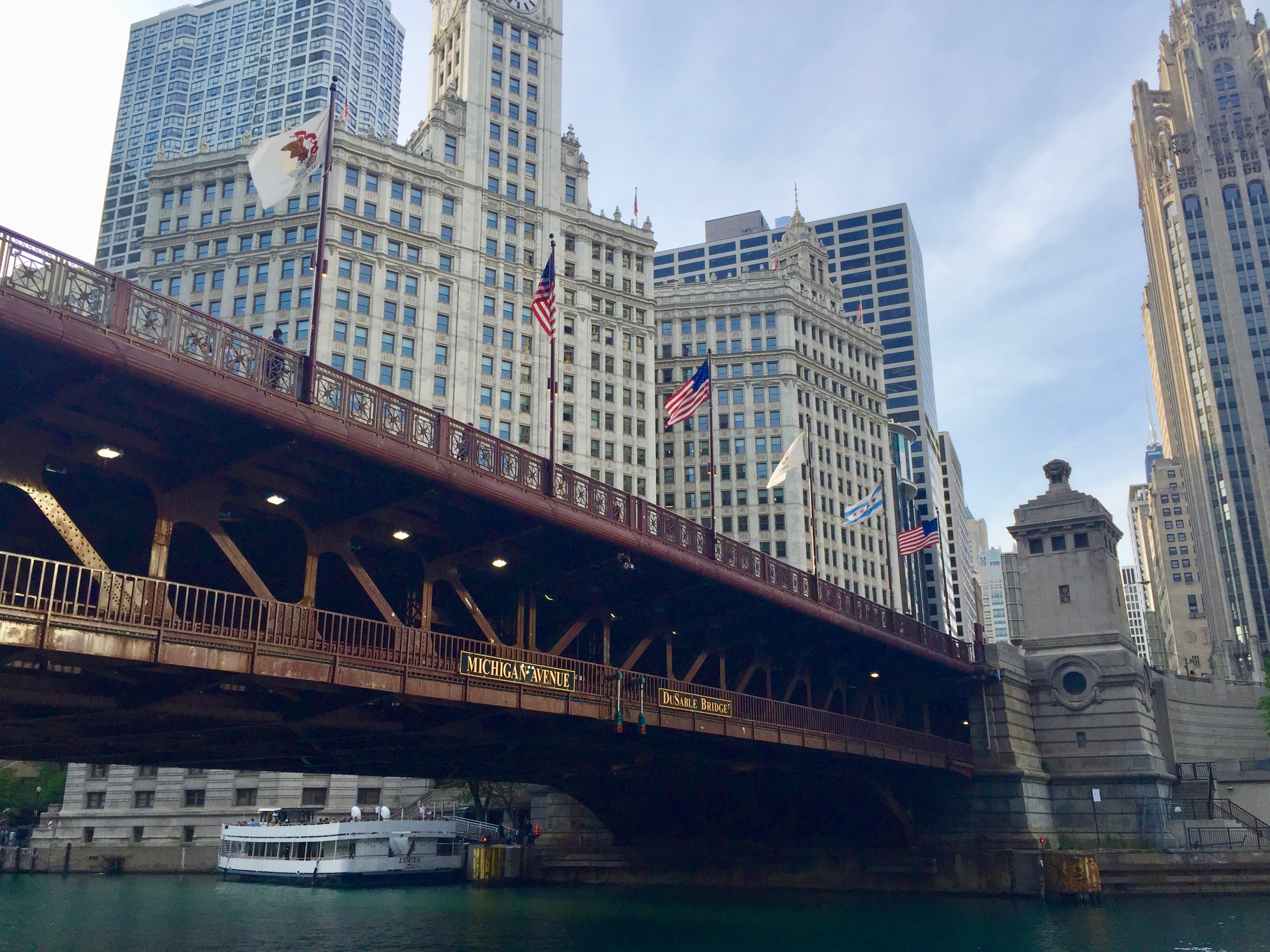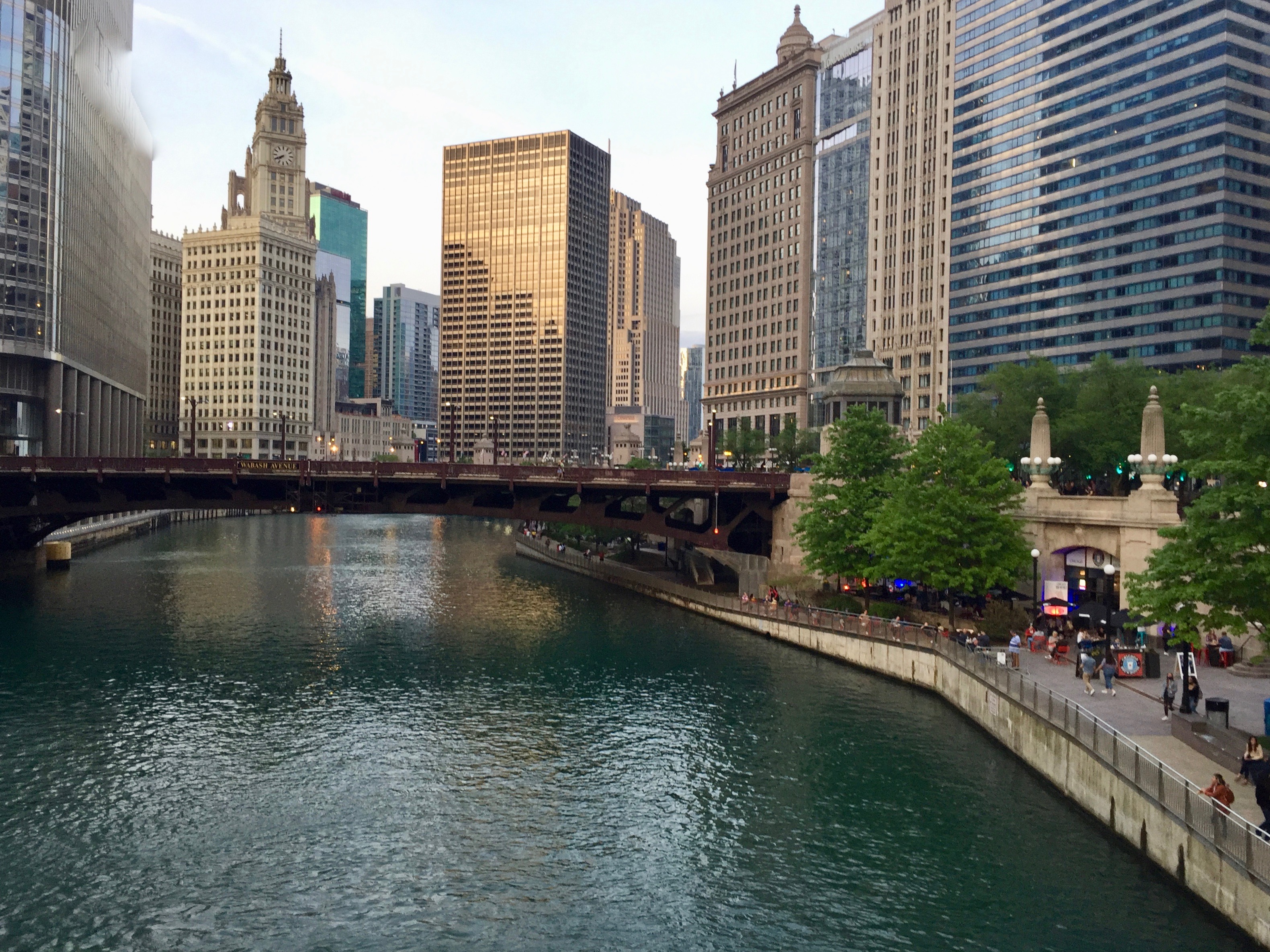 Then we ambled up to the River Walk, along the Chicago River.. which is so scenic. This is the Michigan Avenue bridge and in the background the Wrigley Building, whose clock tower I cut off.