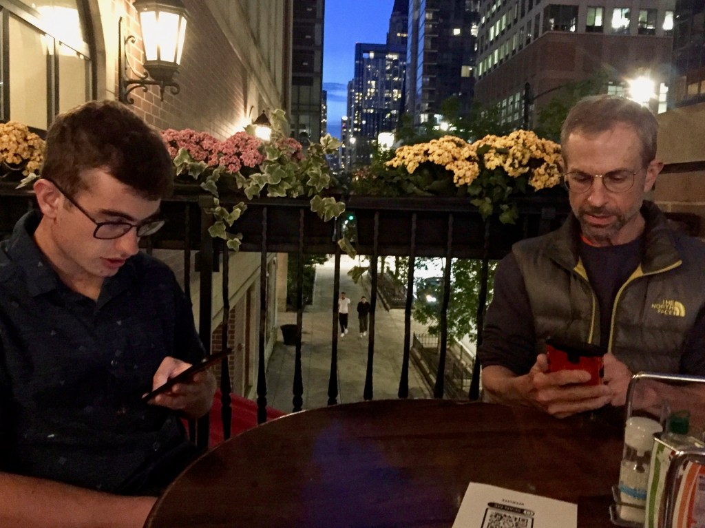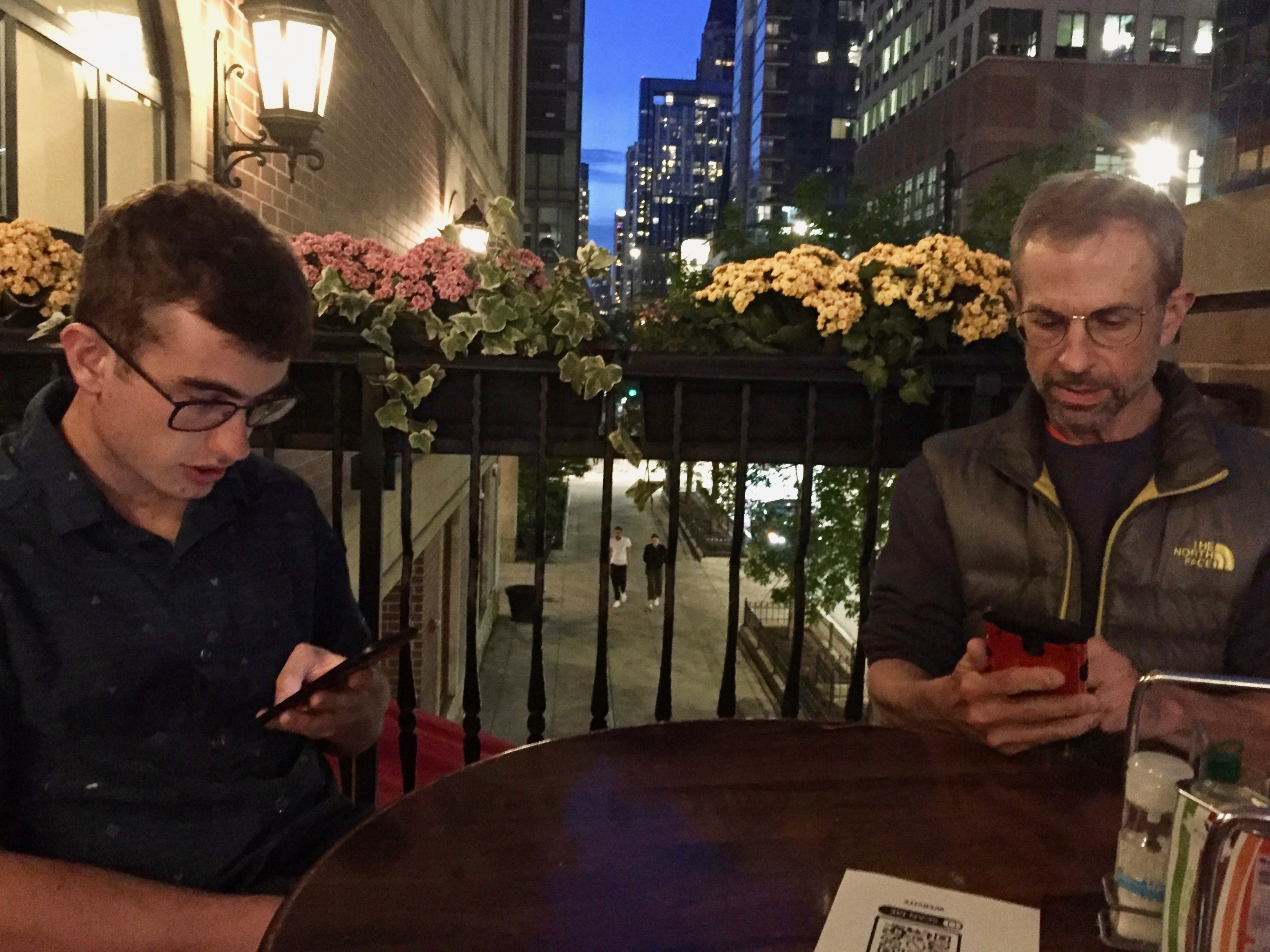 Jim picked some great restaurants this visit… this was first-night dinner, late, at an Italian place called Quartino, just a couple blocks away. Sat on the second-floor balcony on busy State St, enjoying the Wednesday night action and some wonderful food. Casual, Italian tapas-style. Really enjoyed it. J&P are studying the menu… via QR code.