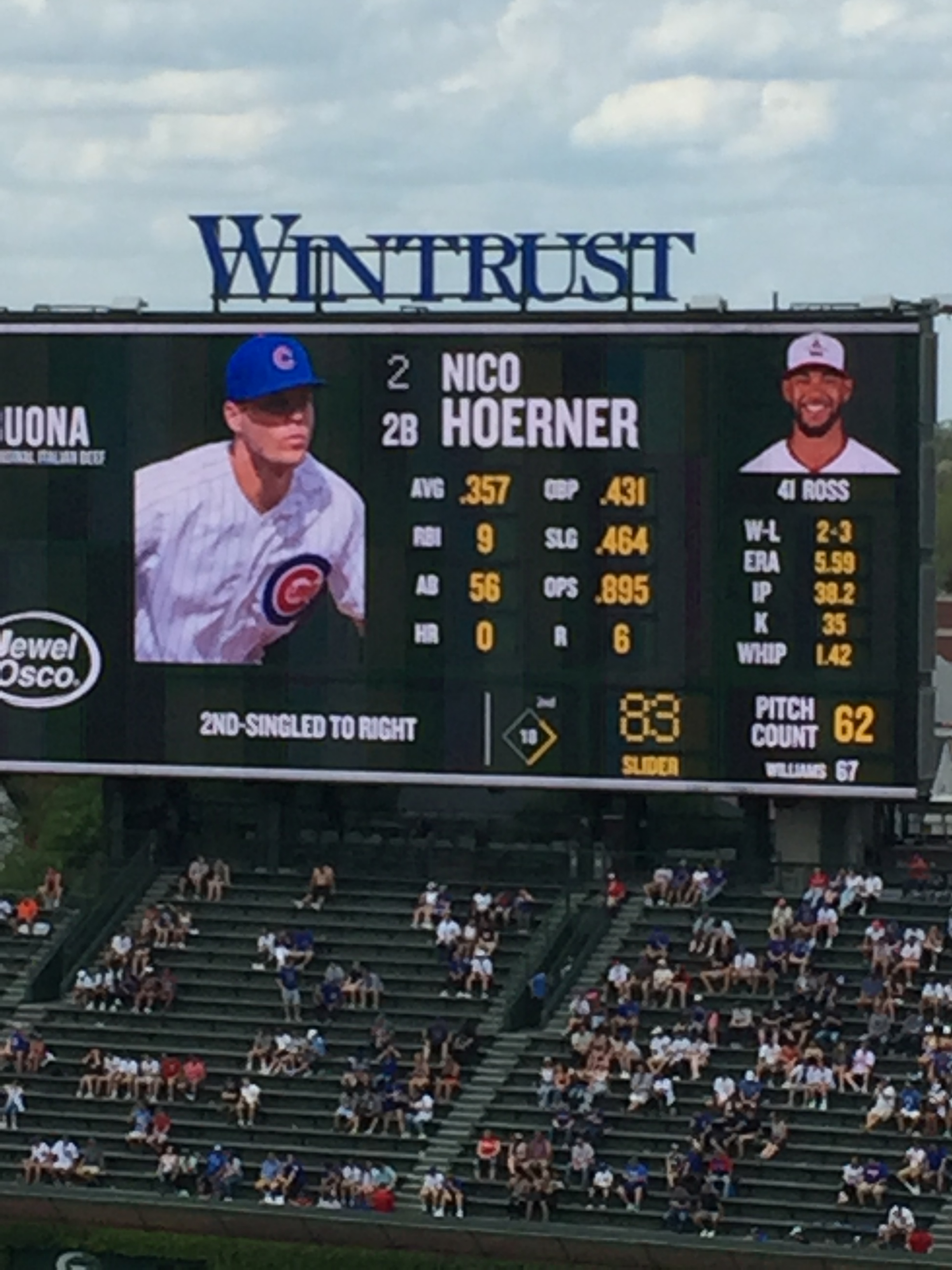 It was a notable day.. another MLB stadium (we counted: Giants, As, Angels, Dodgers, Padres, Mariners, Yankees, Red Sox, and now Cubs — nine of thirty). And, of course, first baseball game post pandemic. But another notable: we got to see a young player — Nico Hoerner — from Oakland who’d been on the Lamorinda travel team (Lafayette, Moraga, Orinda, loosely) and had played against Davis kids. Peter’s travel team had never played Lamorinda, but other regional teams had. Peter knew him right away and he became our player to watch.