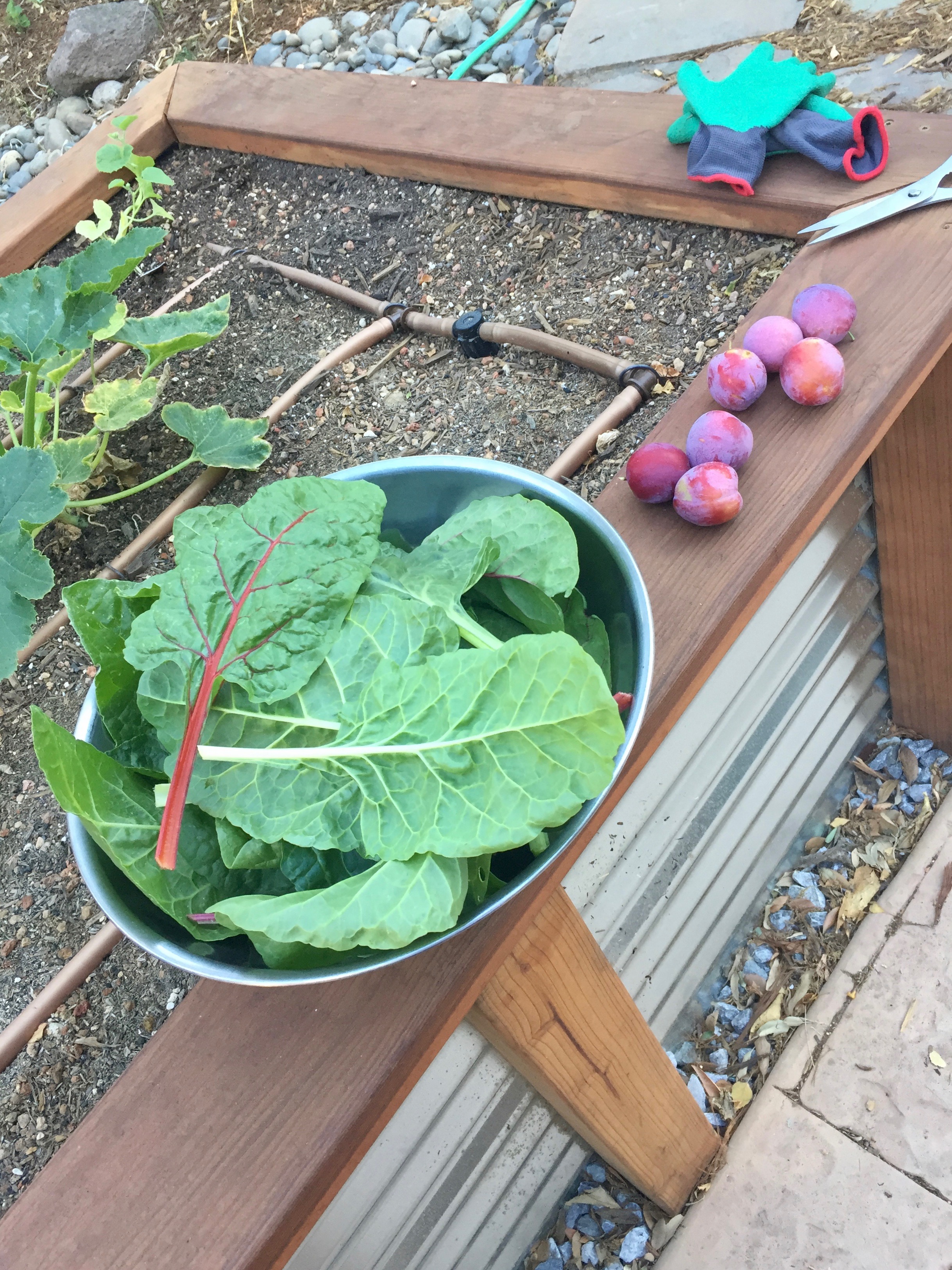 That is a very respectable pile of green and red Swiss chard, and a handful of plums. The plums are a bit hard — not sure they’ll ripen adequately — but at least they are not half-munched by birds and squirrels yet. Jury’s out on those.