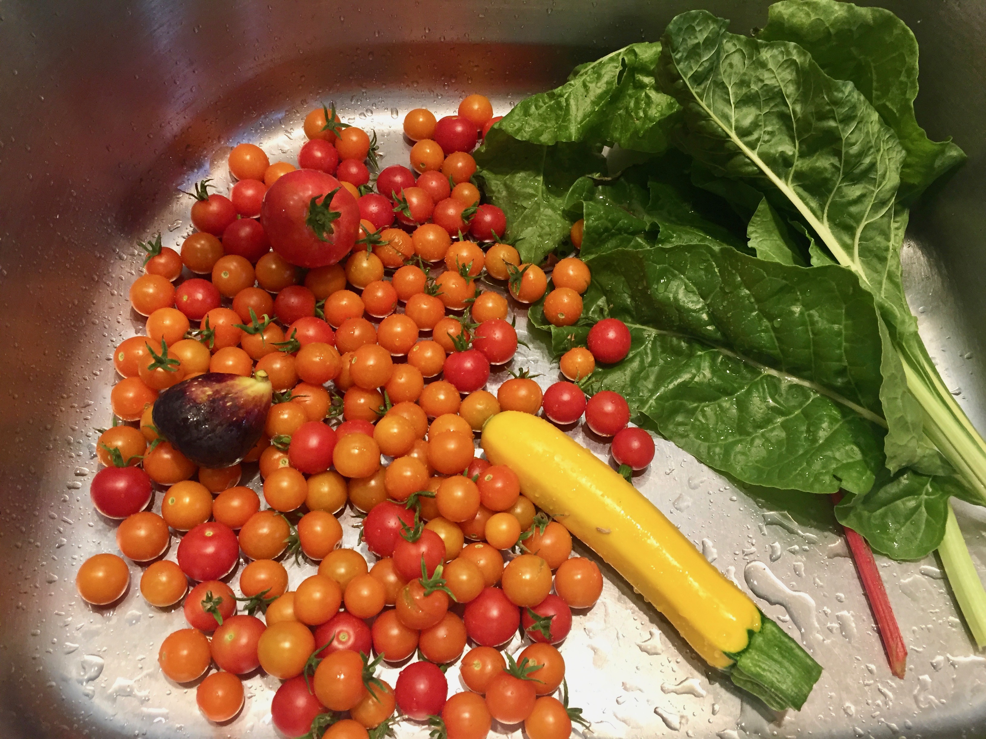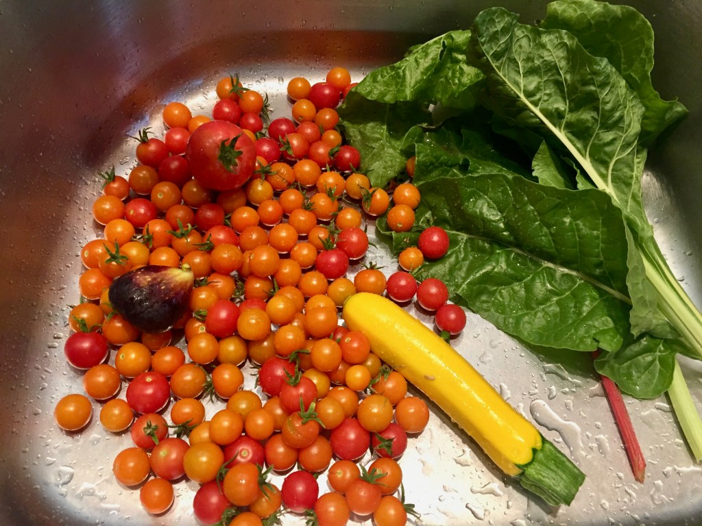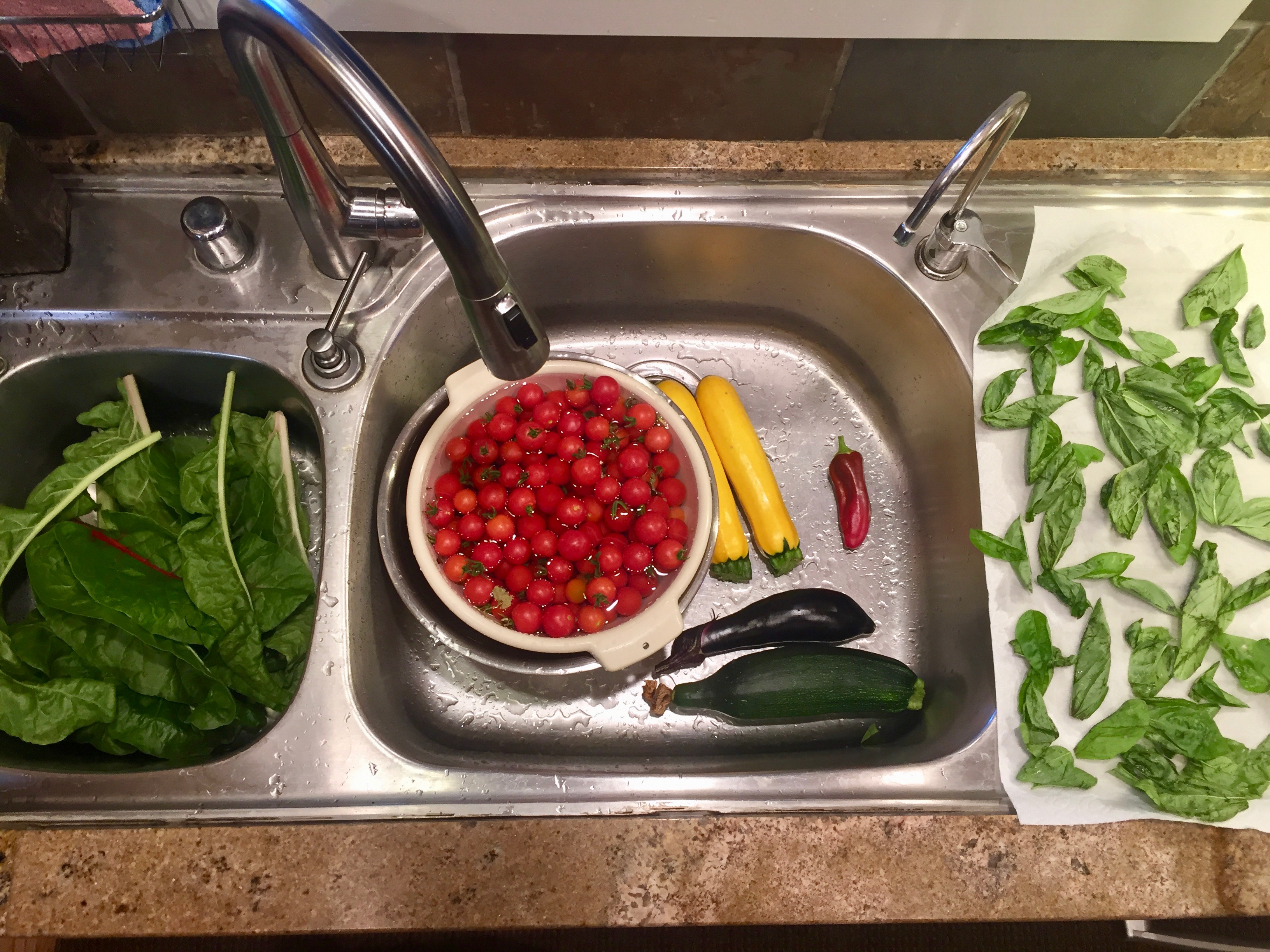 6: Number of pints of cherry tomatoes Jim and I harvested today, along with 2 yellow zucchinis, 1 green zucchini, 1 eqgplant, 1 pepper, 2 large stalks of basil, and 9 large chard leaves
