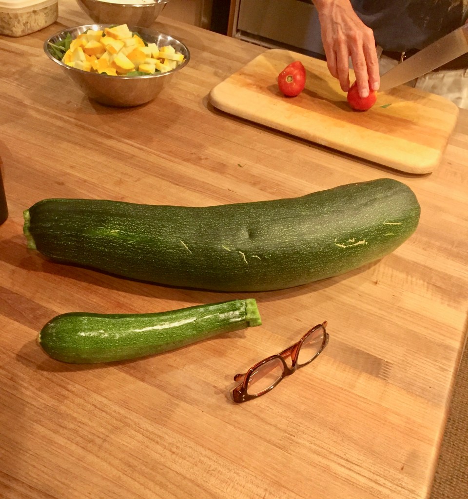 My reading glasses and a normal-sized zucchini for scale. Just obscene, isn’t it?