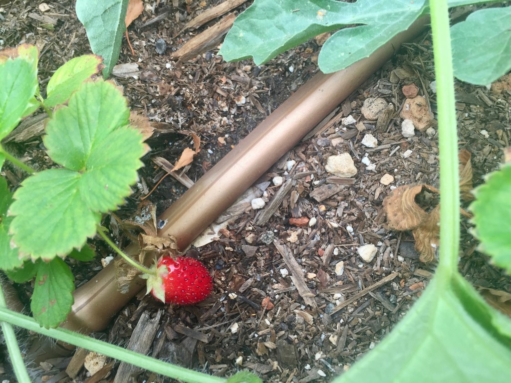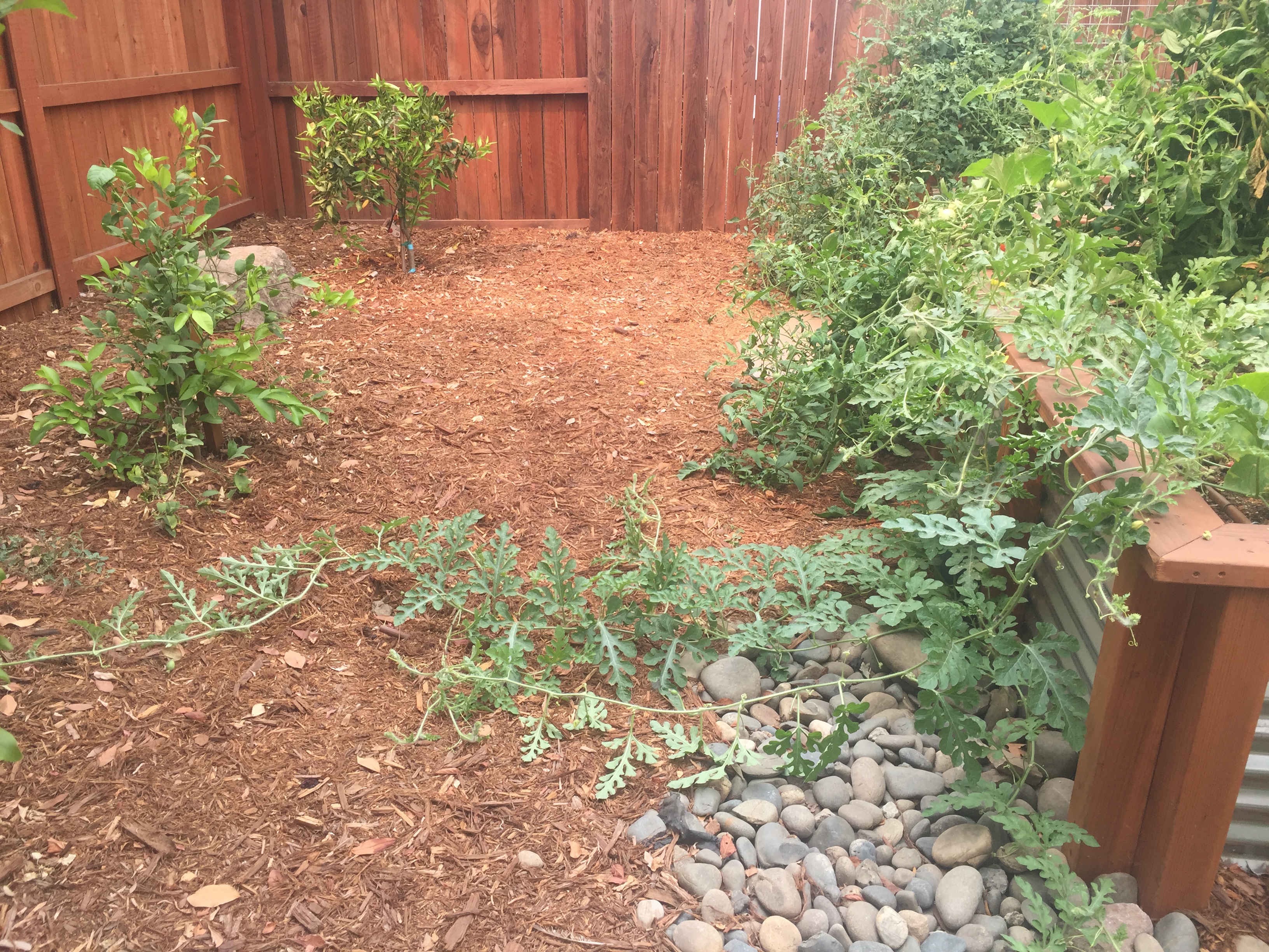 You can see how long some of those melon shoots are… this is watermelon escaping the bed and heading west. I decided to let some of those grow at will.. along with some tomatoes that seem not to be bothering anyone on the back side …