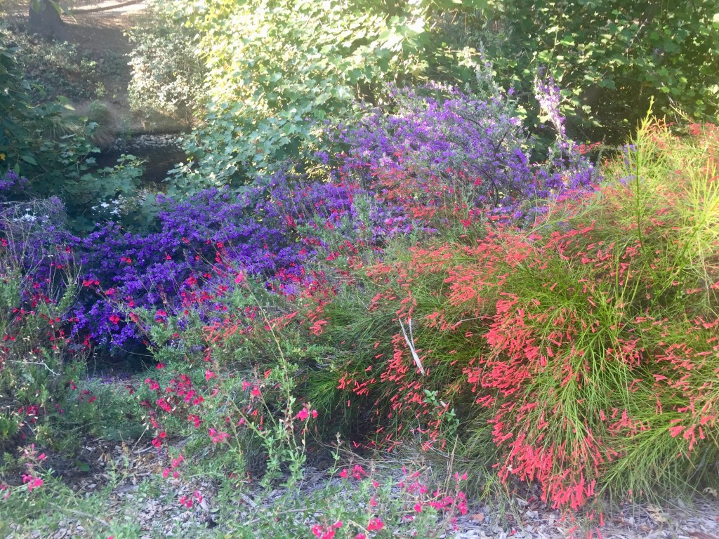 The red in the front is a flower we planted in our front yard giant pot, thanks to neighbors Ray and Verena who walked past our house one day and said, “What your big new pot needs is a splash of color; come by one day and I’ll give you one of ours!” And I did! It’s called St Elmo’s Fire. Ray said it would bloom bright orange for most of the year.