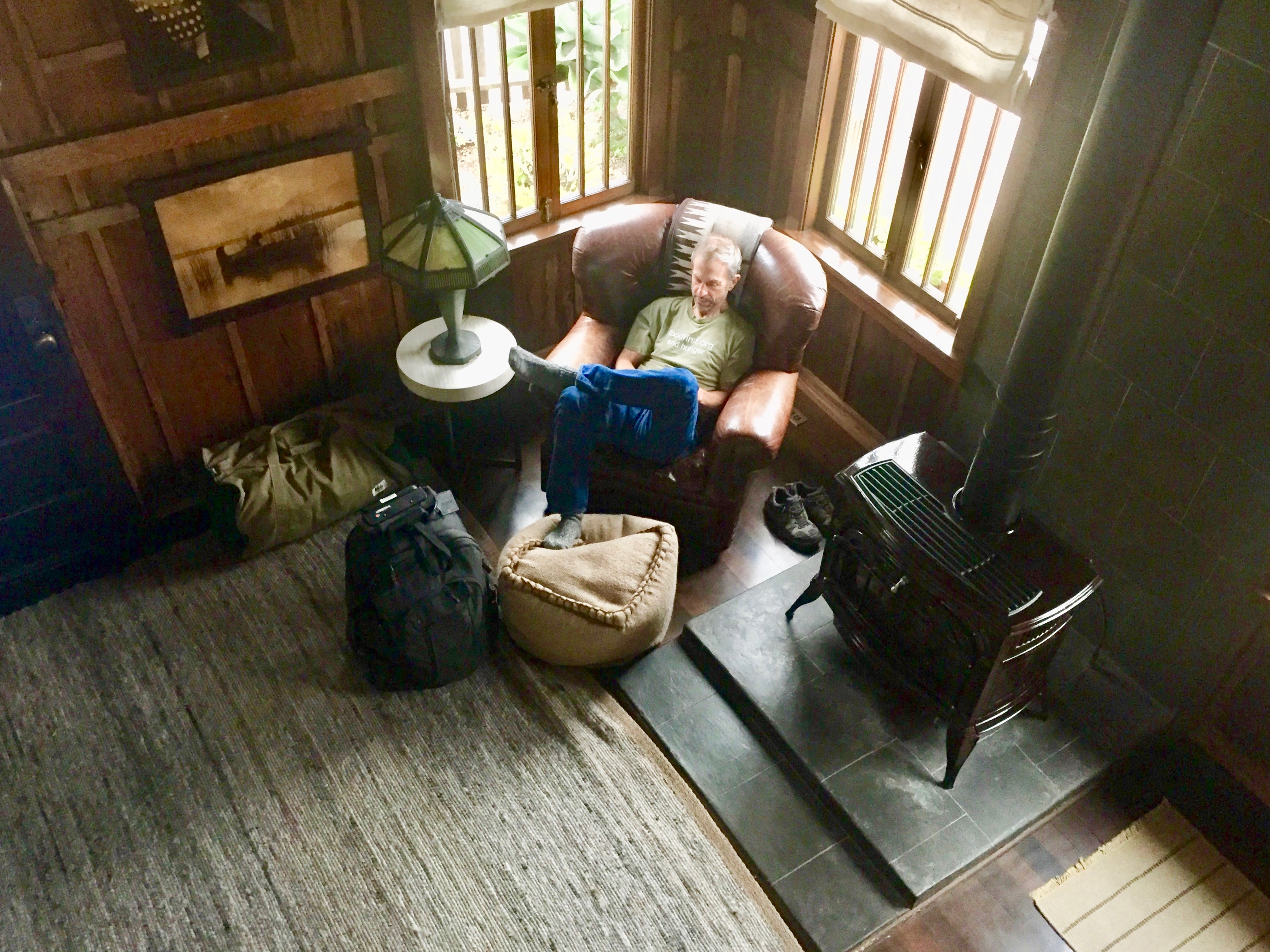We hadn’t even fully unpacked before Jim was in his favorite chair…(he’ll spend a lot of time in this chair over the next four days, usually with a fire going in that stove…).