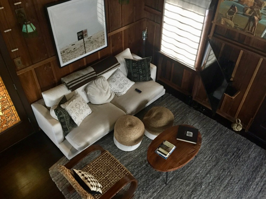 They’ve done a lot with the interior… lots of white, a brand new very fancy bathroom with heated marble floors and a soaking tub, new furniture, etc. I didn’t take a lot of interior pictures, but here’s one of the couch — site of all of our tv watching (Nine Perfect Strangers and Catastrophe were our selections this trip)…