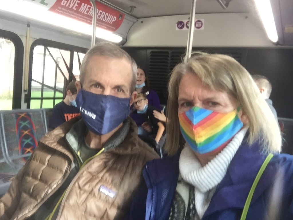 Here we are (it looks like I’m scowling, but I’m not really.. just concentrating on my selfie, or perhaps annoyed by the mask-averse photo-bombers behind me?):