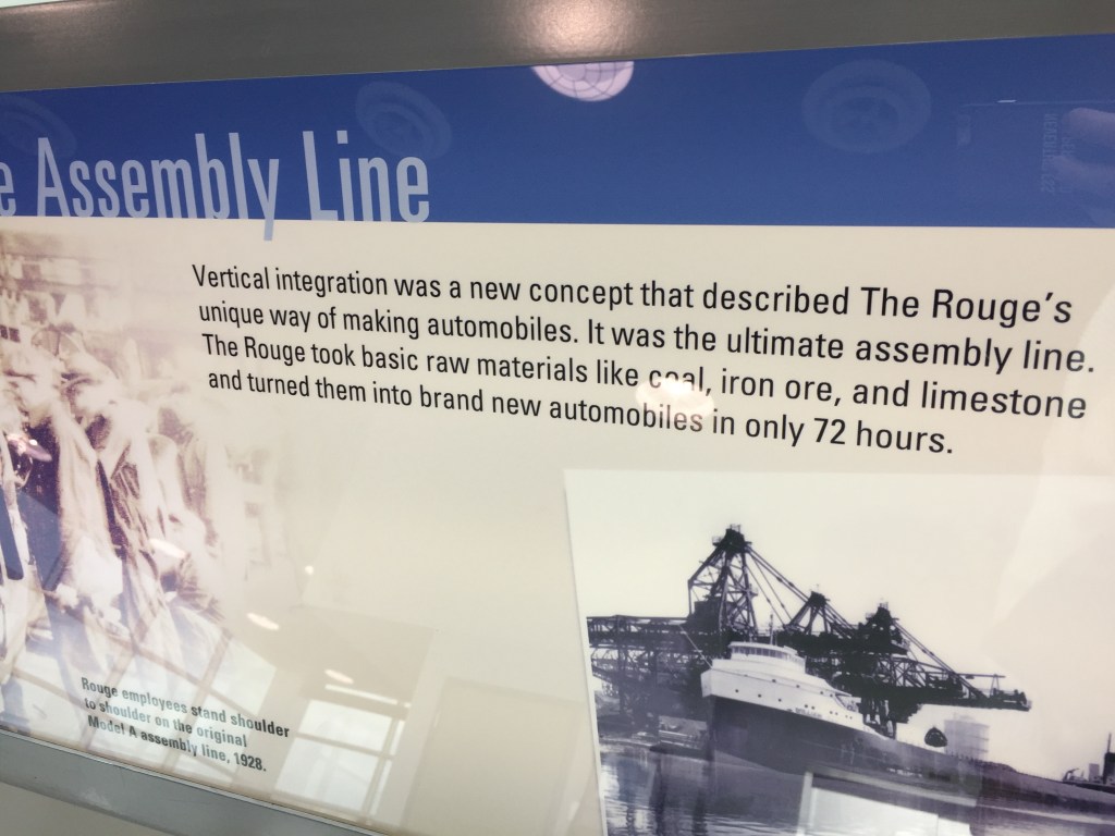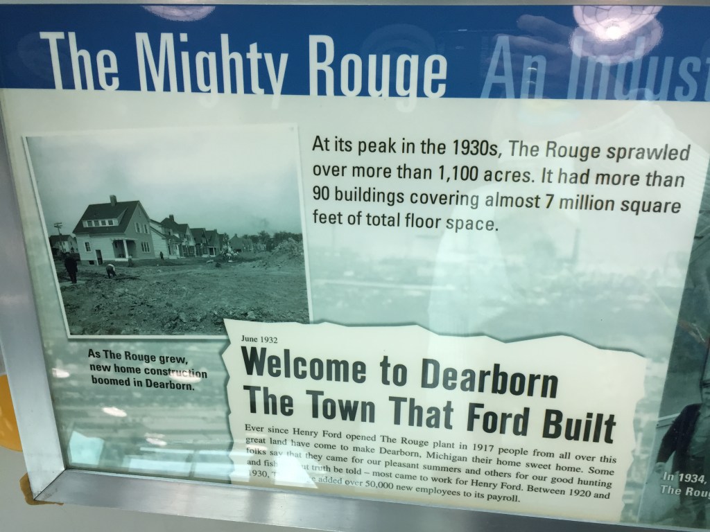 We’d made reservations for the 11:00 tour of the Rouge Ford Factory, again, based on the glowing recommendation of the other folks staying at the Burnt Toast earlier in the week (just remembered the guy’s name: Pat). Dearborn’s about 40 minutes east of Ann Arbor. We parked at the Henry Ford and took a short bus ride over to the plant.