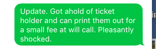 None of this passed muster: not the photos, not the bar codes, not the desperate, pleading faces with weak sob story. We showed up at Will Call at 10am, soon as they opened, and gamely presented our photo’ed tickets and made our case. To no avail. This is my text to Peter: