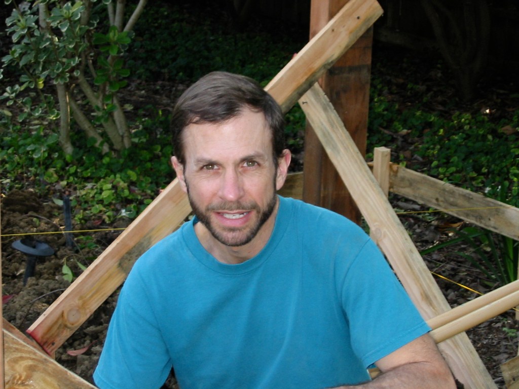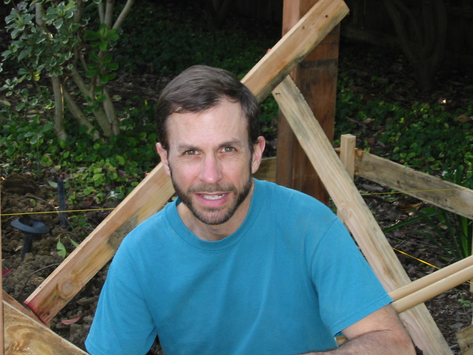 Jim’s plan was to build a 6’x6′ (I’m estimating) second story platform, accessible via metal ladder, with a slide descending down the backside, a swing attached to the side and a sandbox comprising the entire ground floor. Oh, and a peaked roof covering the whole thing and glassless windows in all four directions. The whole thing would sit on a huge bed of bark, a foot (or two?) deep all around, enclosed with redwood borders.