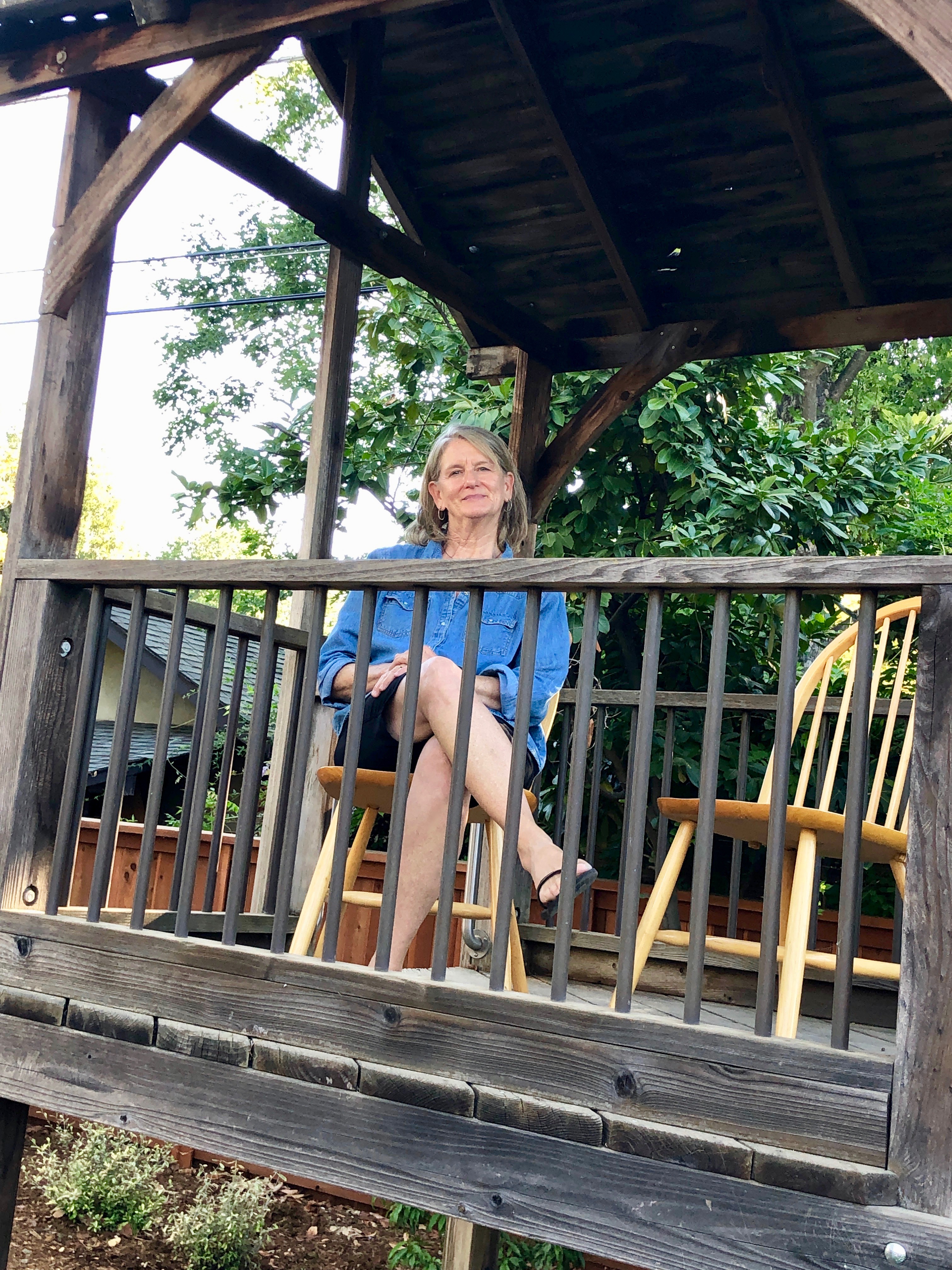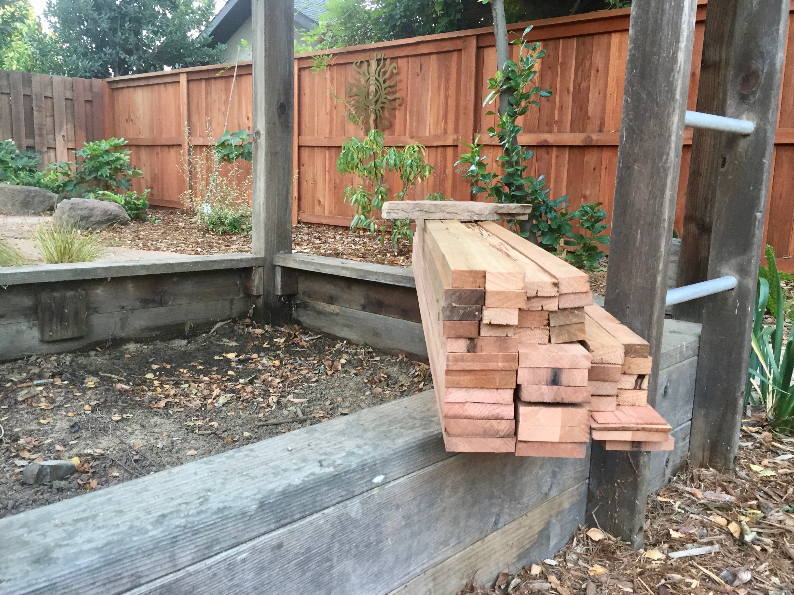 It’s wood that Jim salvaged from our former trellis and then cut to fit for his latest project: converting Peter’s play structure into an observation tower… sort of an adult play structure, a place we can sit, read, drink wine. (And by we, I mean me.)