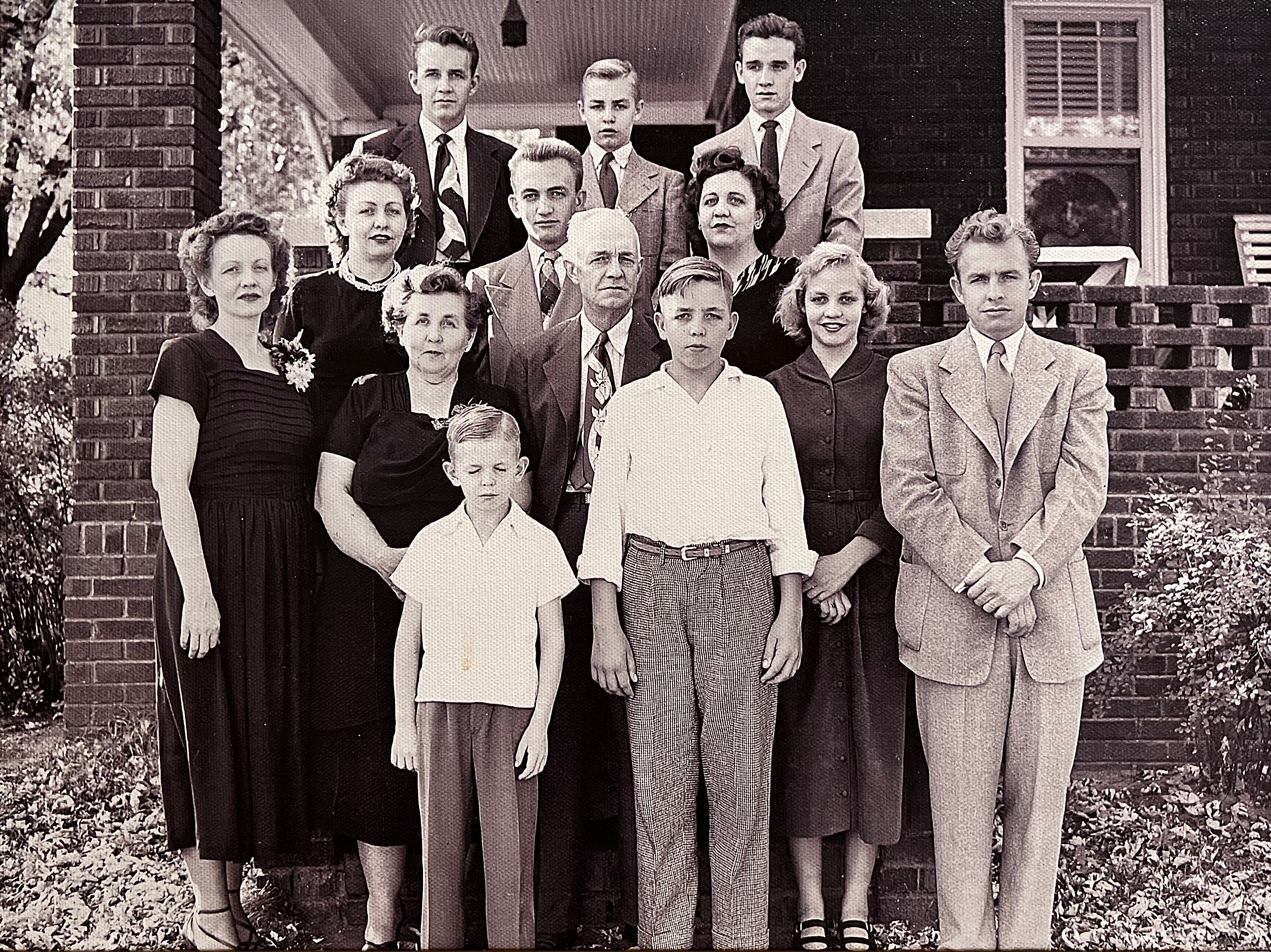 This is the original Frame family: In the middle, James Horace Frame, and to his right, his wife (forgive me, I can’t remember her name); and surrounding them, their eleven children. Jim’s dad — James Horace Frame, Junior, is the eldest son (third born) and is in the front row, far right. Nice looking fellow. Dean is well down in the kid line-up, maybe the middle child?, and is that (also) very handsome guy in the top row, far right. This is on the porch of their Kansas home (where all eleven kids were born).
