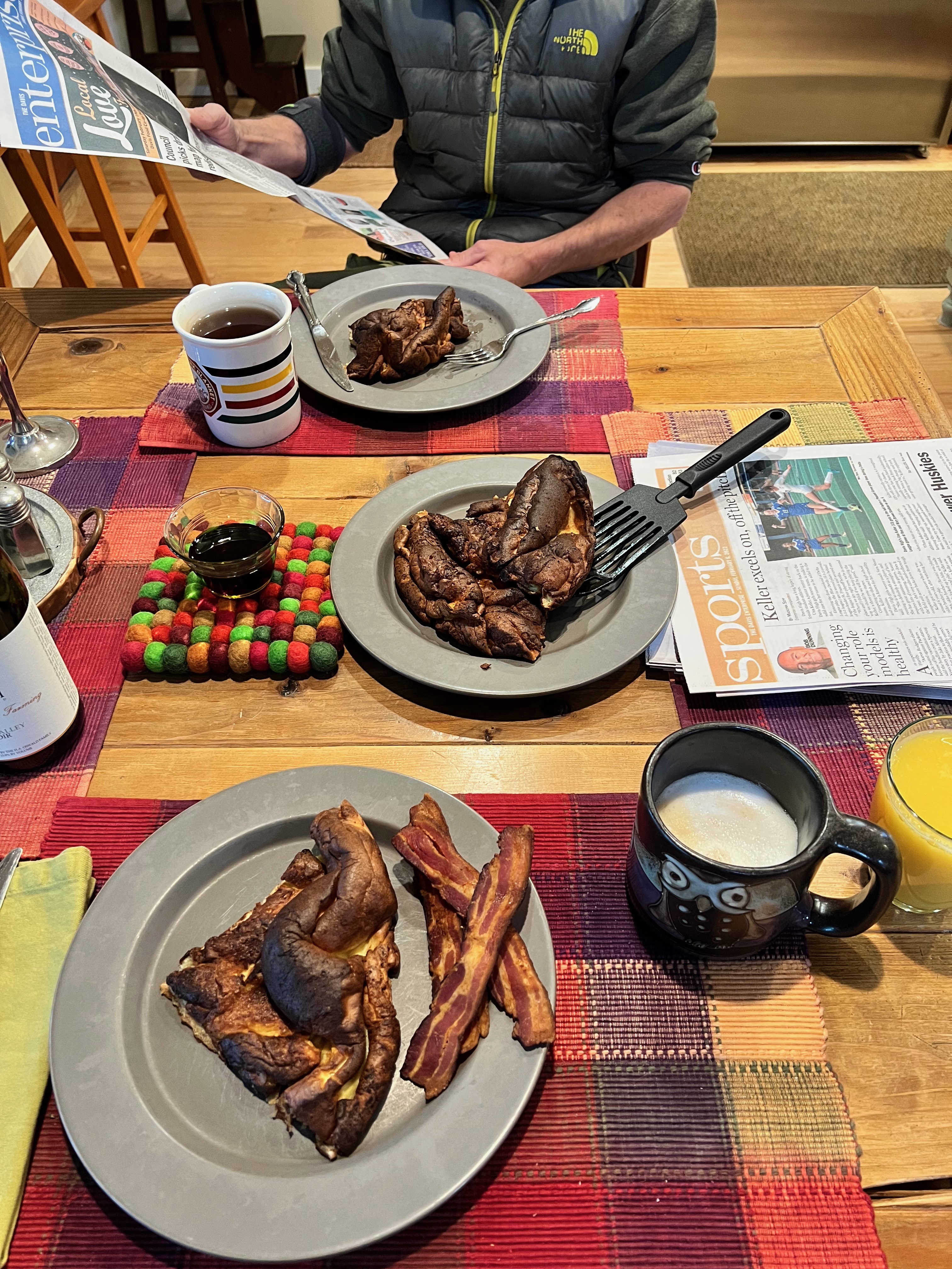 This is Jim’s first attempt at Dutch Babies. What I love about this, besides the Dutch Babies, was that he wanted it to be a surprise, so was careful about keeping the recipe hidden when I ventured into the kitchen, for example. Last night, in an air of mystery, he simply announced he had a plan for this morning’s breakfast. So I knew something was up.