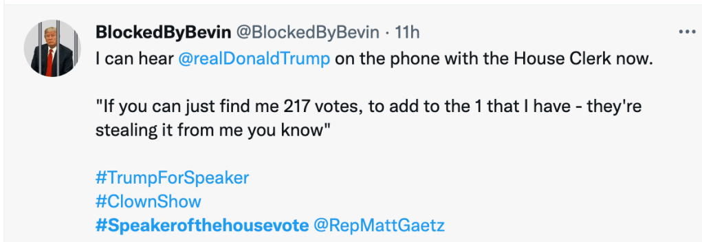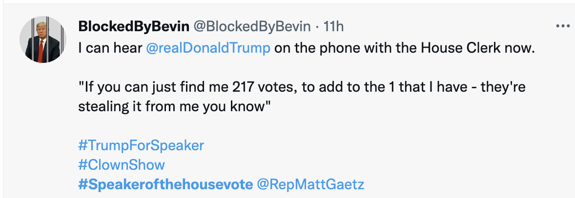 Re: the title, I’m not sure who the biggest loser is.. McCarthy, trump (my fave today), the GOP, the House, democracy, all of us… ? As usual with these nutcases, it’d be funny if it wasn’t so sad.