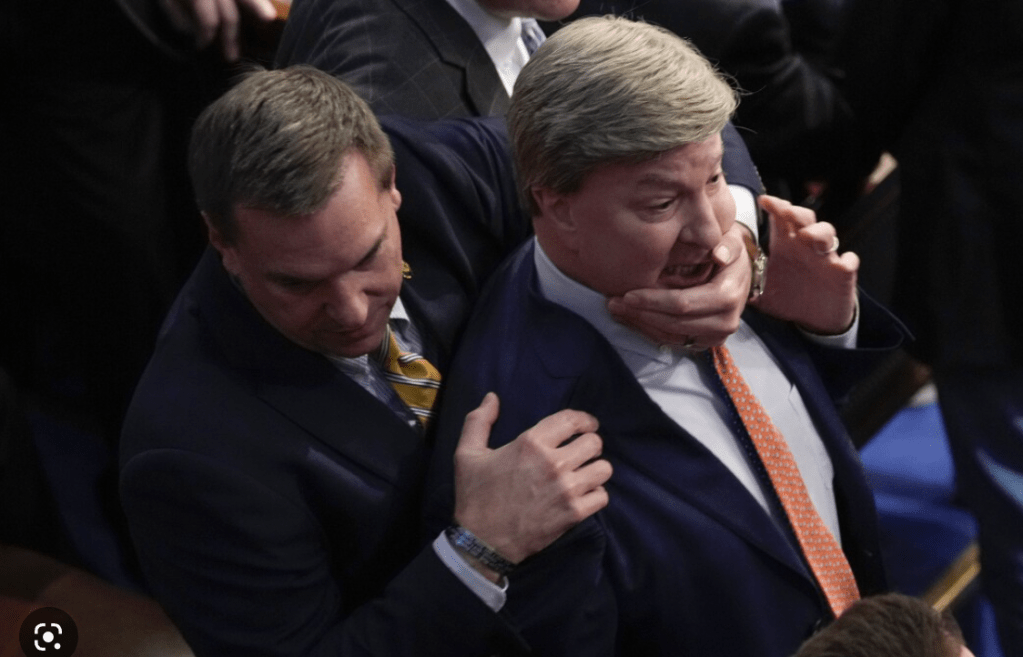 I’m no McCarthy fan, but I certainly understood the anger at the stunts these chaos caucus members — led by Gaetz and Boebert — pulled. This guy (the one with the maybe toupee) was angry enough to lunge at Gaetz, but was held back by the quick-reacting other guy. A commotion ensued!