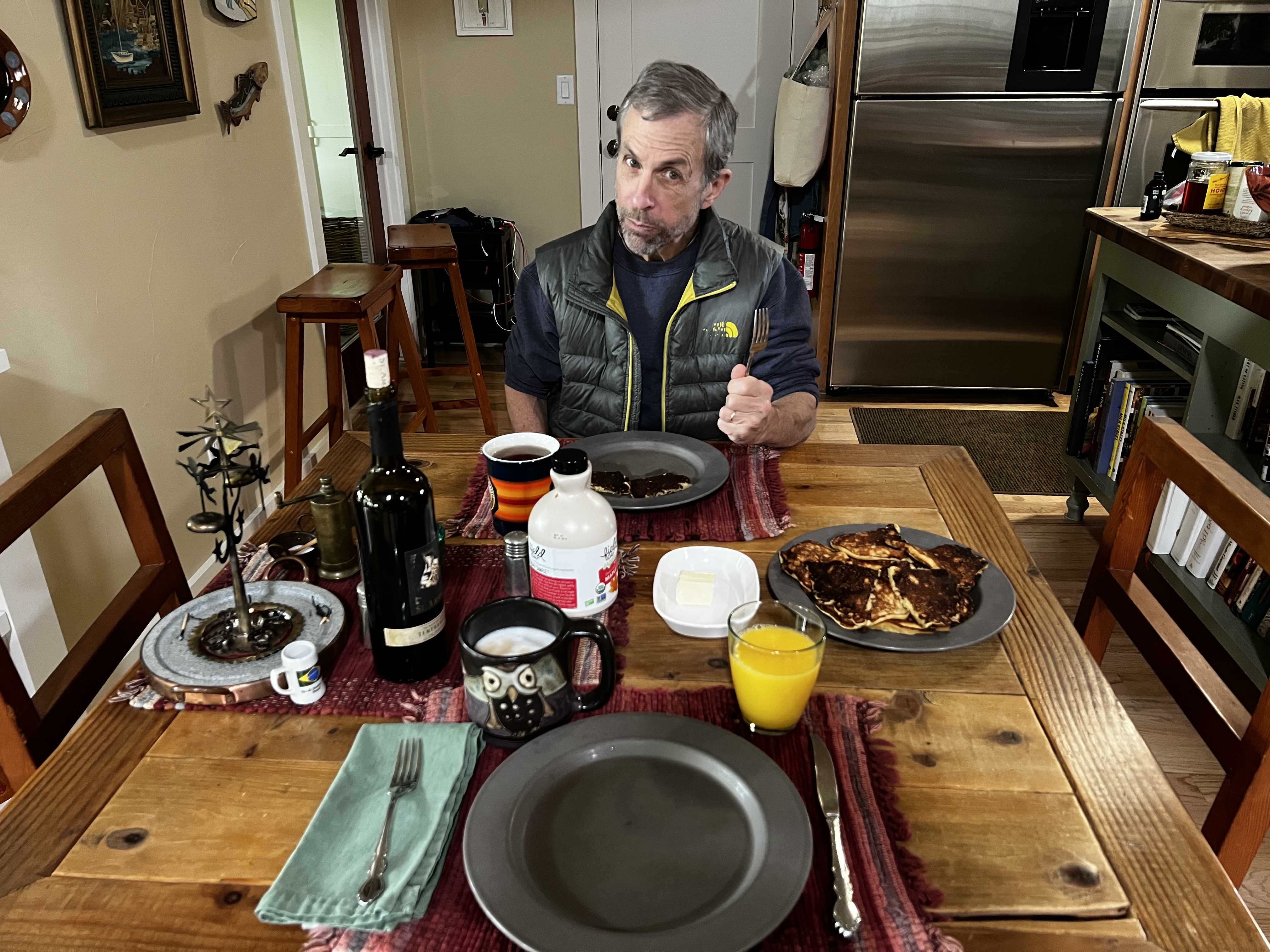 Making pancakes for breakfast, since all of downtown is also out and we couldn’t go out for Sunday brunch. We had to light the stove manually, but the rest of cooking was pretty normal. Oh, had to heat water and milk on the stove for coffee.. forgoing my new fancy pants espresso maker.. these are the sacrifices we make.