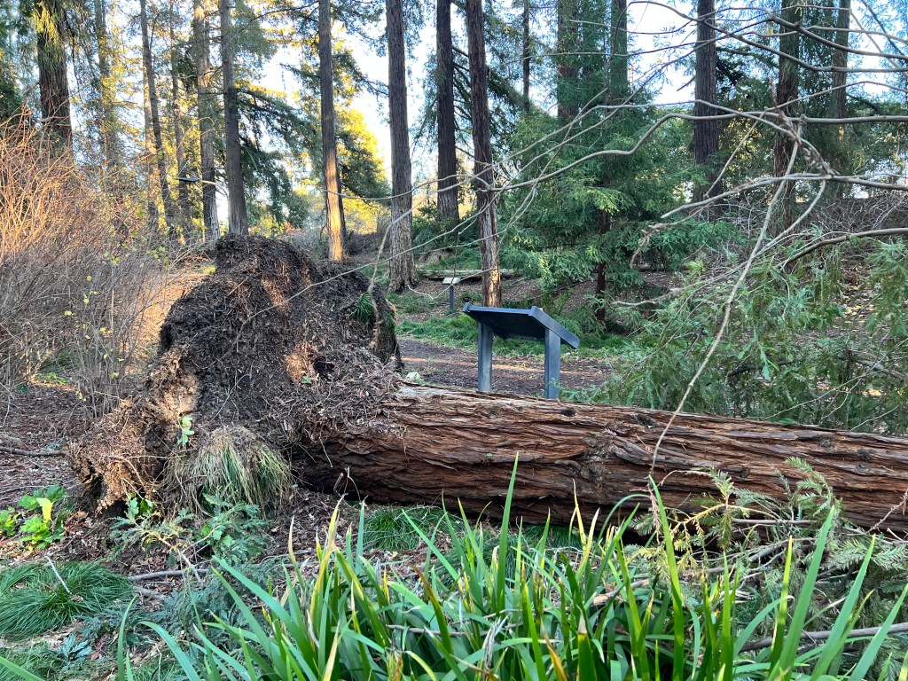 There were a LOT of trees down. They blocked the path in numerous places. The one that caught my eye was the redwood in the redwood grove. I was struck by the shallowness of its roots and, of course, thought of the giant ~130 foot redwood about 100 feet from our house. Guessing on the numbers here, but terrifies me every time the north wind blows.