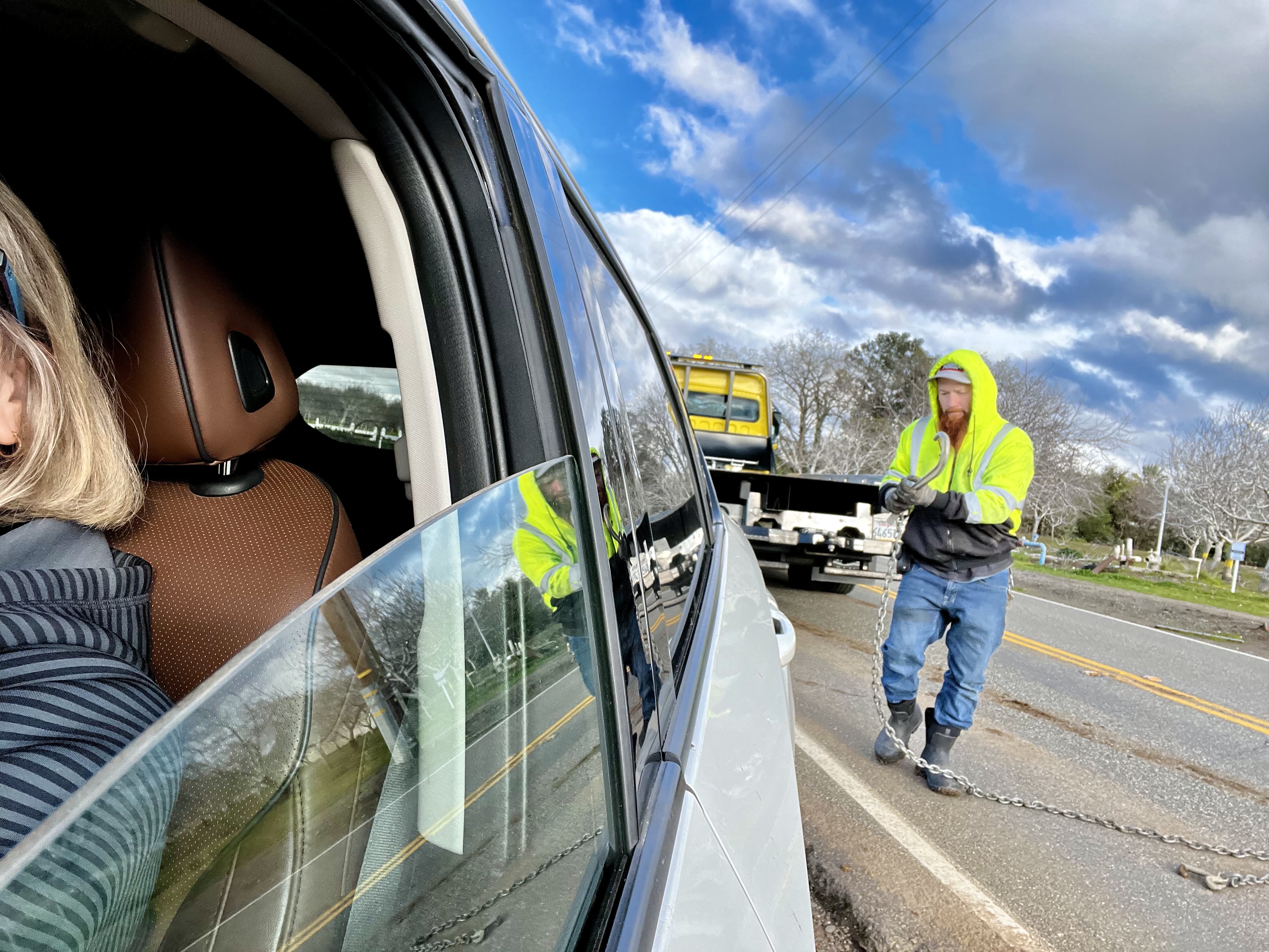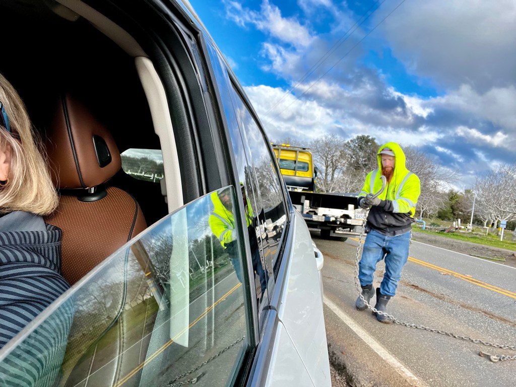 Some Facebook posts, texts, calls, and a conversation with a nice sheriff (who stopped to check out my stuckness and called an AAA towing service in Winters) later, I was bailed outa my mess. A mere hour of somewhat amusing drama. I was completely grateful for the kindnesses of friends who offered suggestions — including offers of help. Made me feel not so alone out there on a remote road.