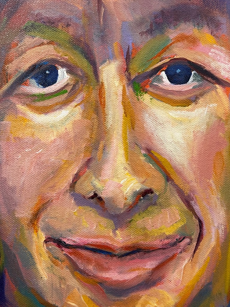 What the detail tells me is, there is a level of complexity that is way more than meets the eye. I’m fascinated by the detail of artists’ paintings. For example, the splashes of color on Phil’s self-portrait. I can guarantee it’d never occur to me, if I were to paint a self-portrait, to put green or yellow or blue or red lines in those places where he’s done that. If I didn’t zoom way in on that self-portrait, I’m sure I’d never have noticed ANY of those colors … I’d have only seen his likeness, his gross (as it were) features. Like Wayne Thiebaud (a mentor and inspiration to Phil), the color is what makes the paintings pop, but you kind of have to look to find it.
