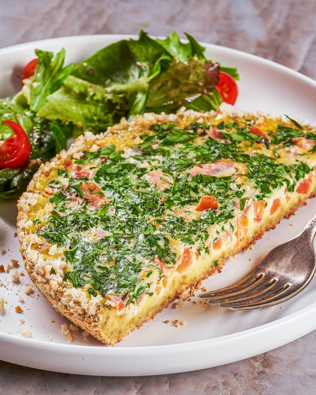 A stovetop quiche with breadcrumbs for a crust. Really.