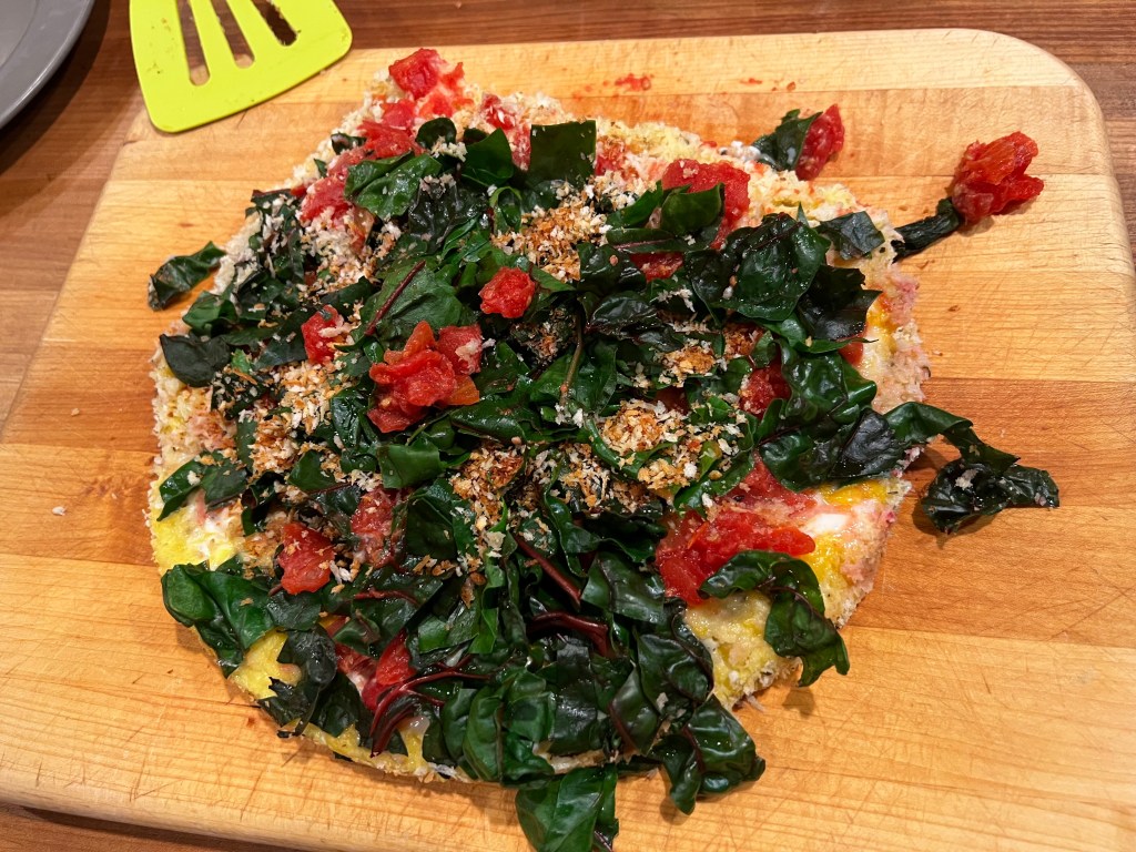 Thing of beauty, right? We maybe didn’t need to de-pan it to cut wedges for our dinner.. but did — it was a two-person job! It’s only not-round above because some of the tomato/chard topping toppled off when we slid the “quiche” out of the pan, otherwise, it’s a pretty great looking thing.