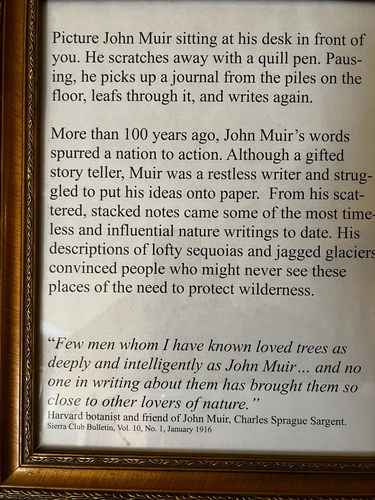 Cool, huh? I took lots of photos inside the house.. their bedroom, a gorgeous piano, the kitchen.. all kinds of things I’ll spare you. But it was so very cool to know he lived right there and to try and picture his daily life. I’m a fan girl. I mean.. I attended John Muir College at UC San Diego, and Muir’s presence is all over Yosemite. He founded the Sierra Club and is the father of our National Park system.