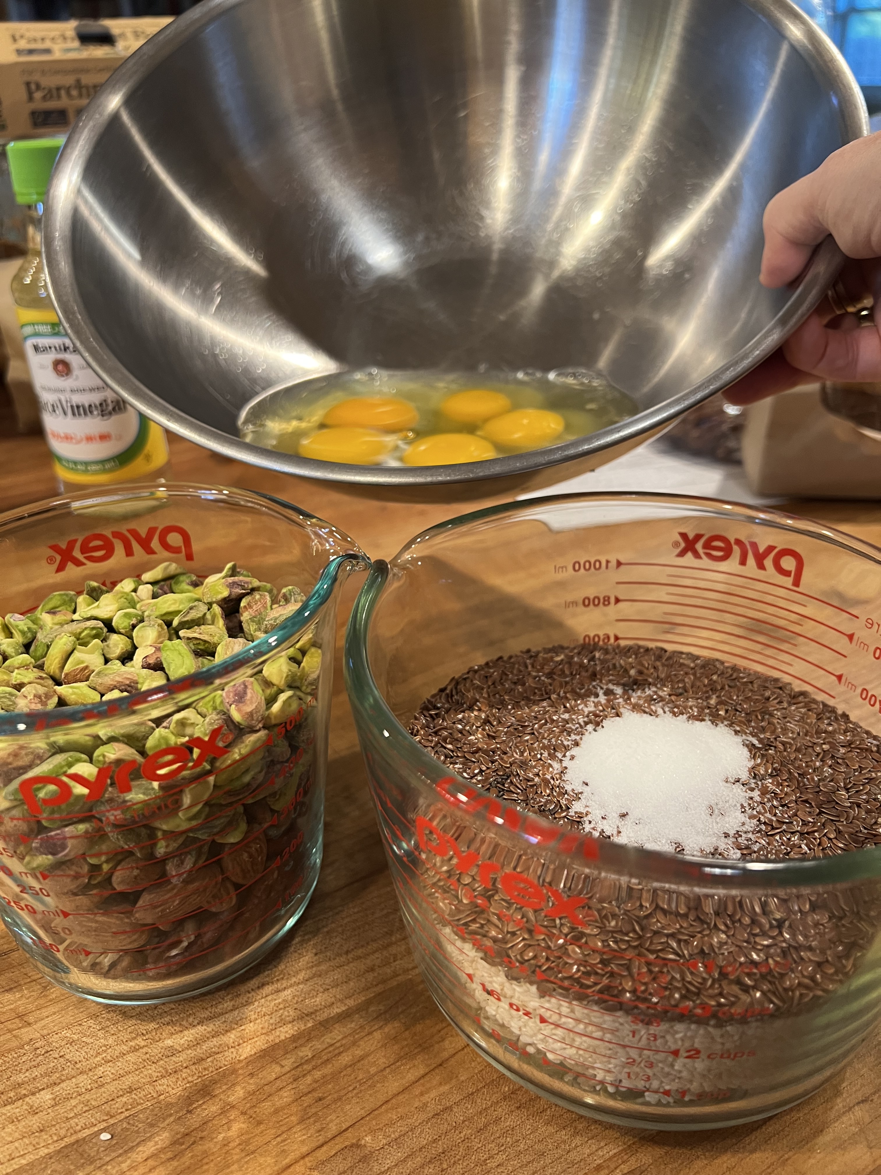 To these you add five eggs, 1/3 c olive oil, salt and pepper. That’s it. Put it in a parchment-lined loaf pan and bake at 325 for an hour-ish.
