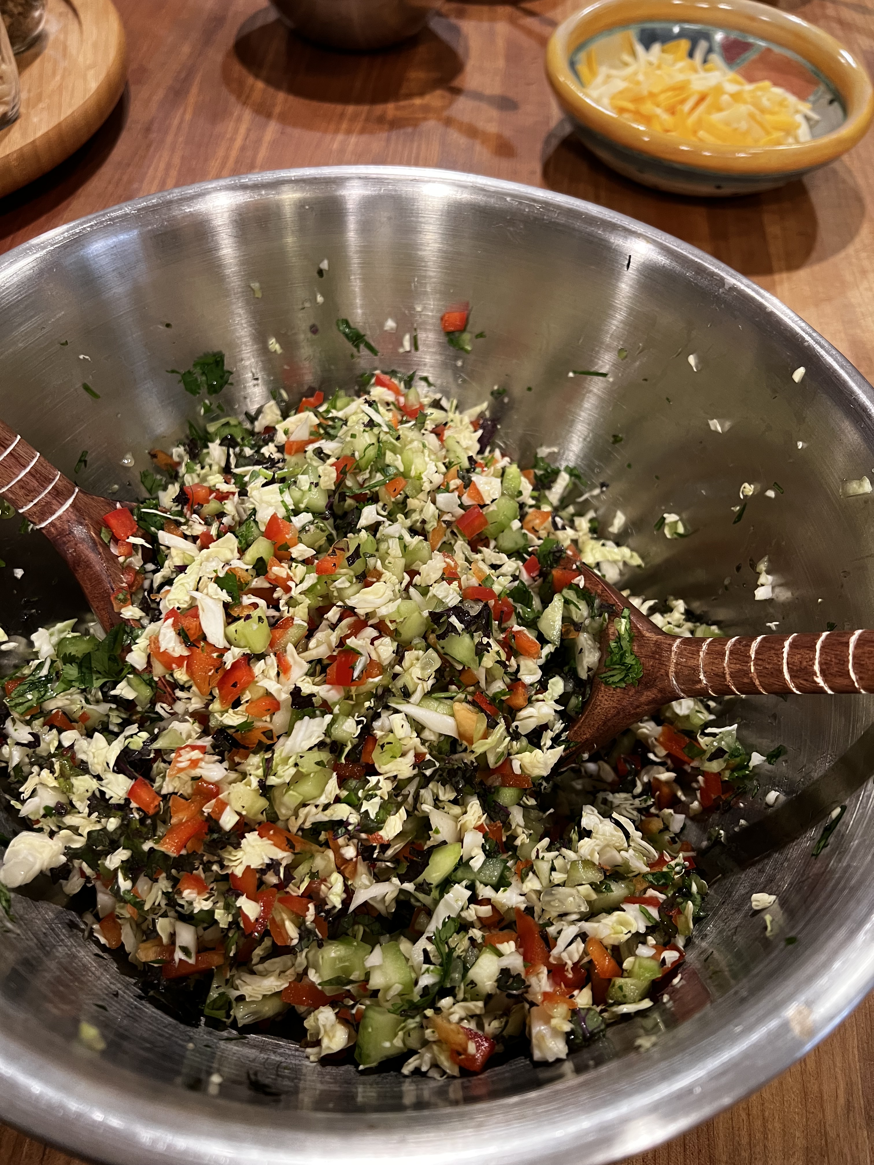 Chopped into tiny bits: cabbage, kale, cucumbers, red bell peppers, cilantro. Served with a dressing of: ginger, garlic, mayo, rice vinegar, sesame oil, salt and pepper. Topped with sesame seeds (added subsequent to this photo).