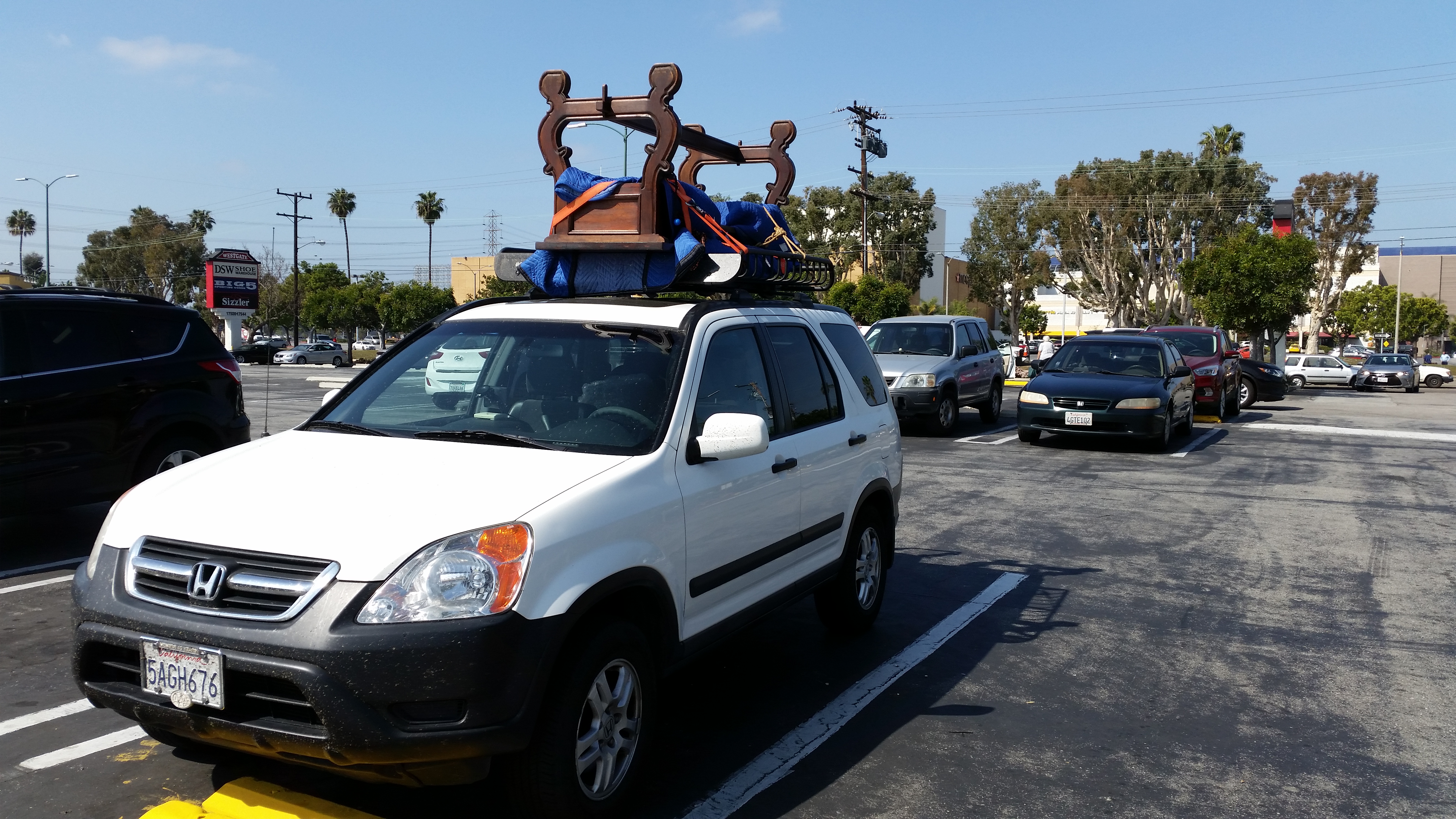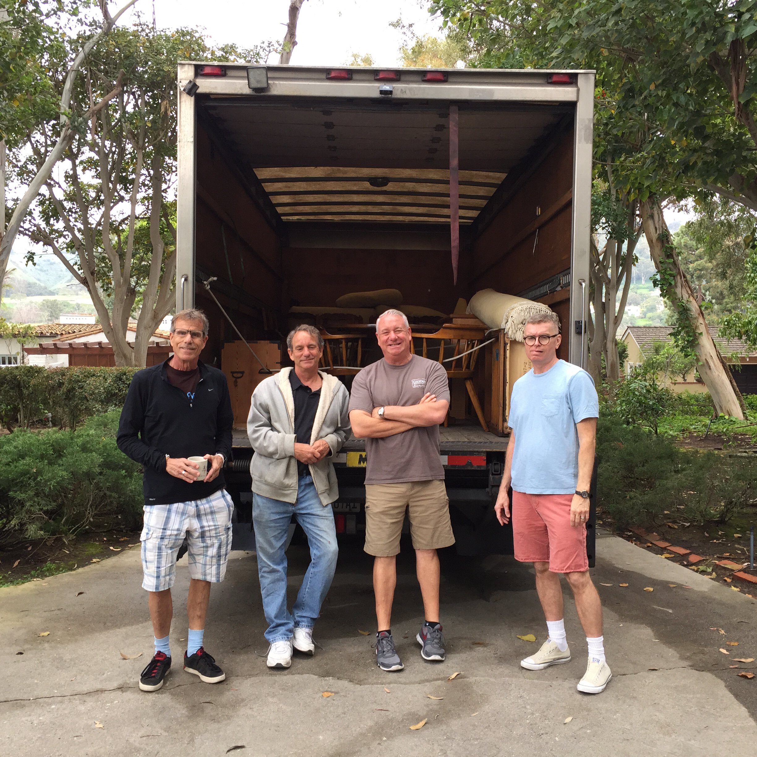 Here we are on move-out day… Matt had rented a truck to first haul stuff up to Chris’s apartment, then to re-load and haul stuff down to Matt and Michael’s. Jay filled a POD with his items, and Jim, Betsy and I packed everything I was taking into, and on top of, our Honda. Jim got a photo of his rig somewhere along I-5. He drove the car back to Davis; I would fly some days later after closing up the house.