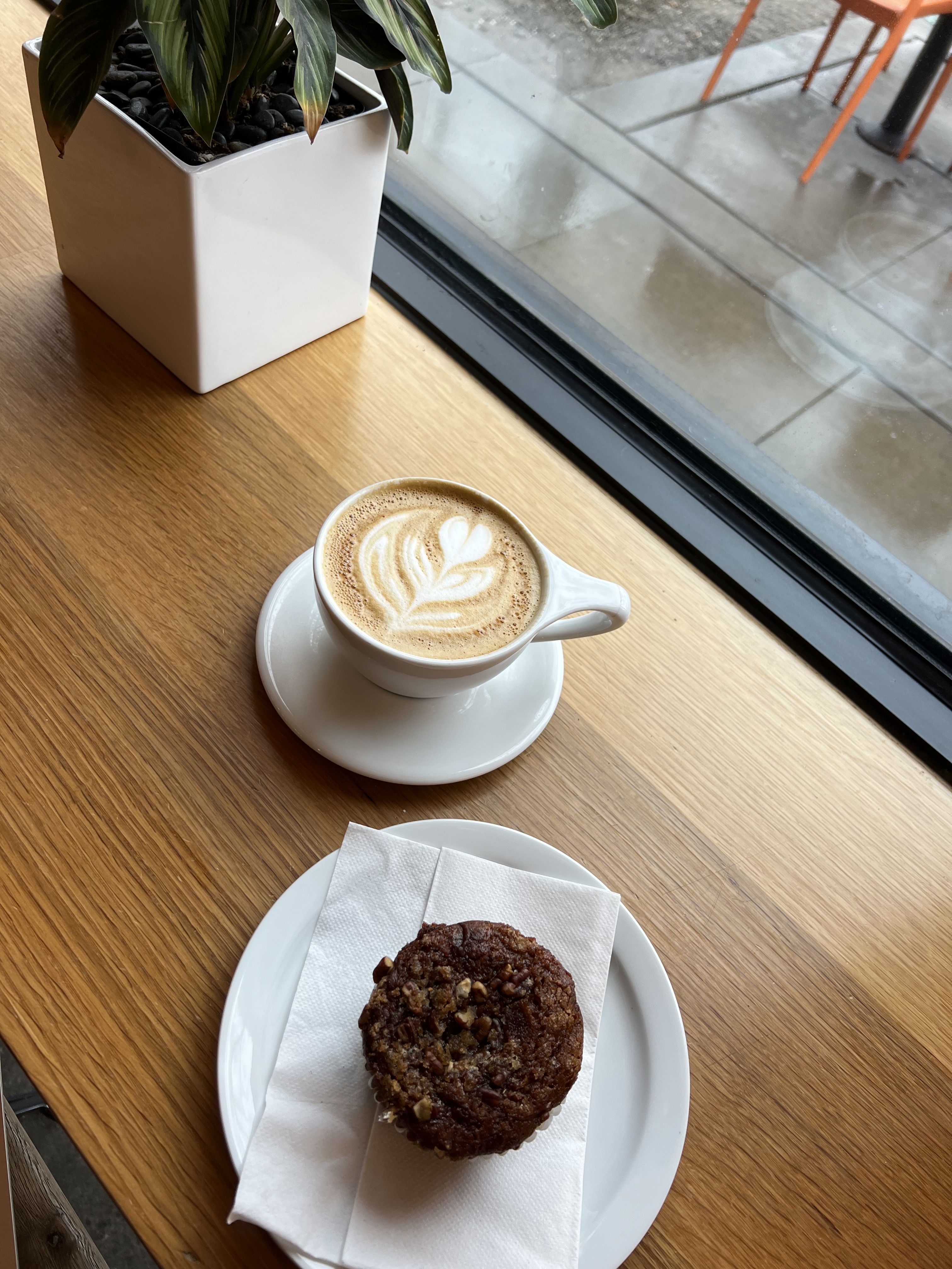 Sat in the window at Temple Coffee this morning. Things to notice: an absolutely beautiful latte and an absolutely fantastically tasty pumpkin muffin, AND, rain on the sidewalk. Seemingly never ending rain.