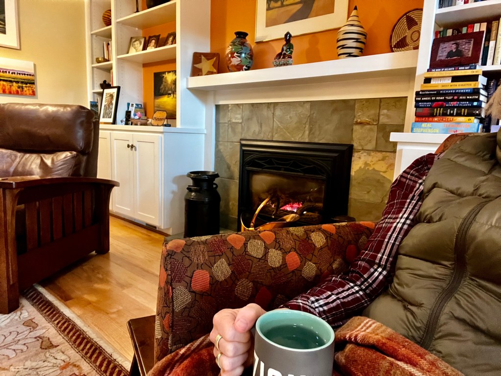 And finally, as I write this, I’m still sitting beside a fire to keep warm, still drinking hot tea to keep warm, still draping a wool blanket over me to keep warm, still wearing a heavy flannel shirt to keep warm, still wearing a down vest in the house to keep warm…