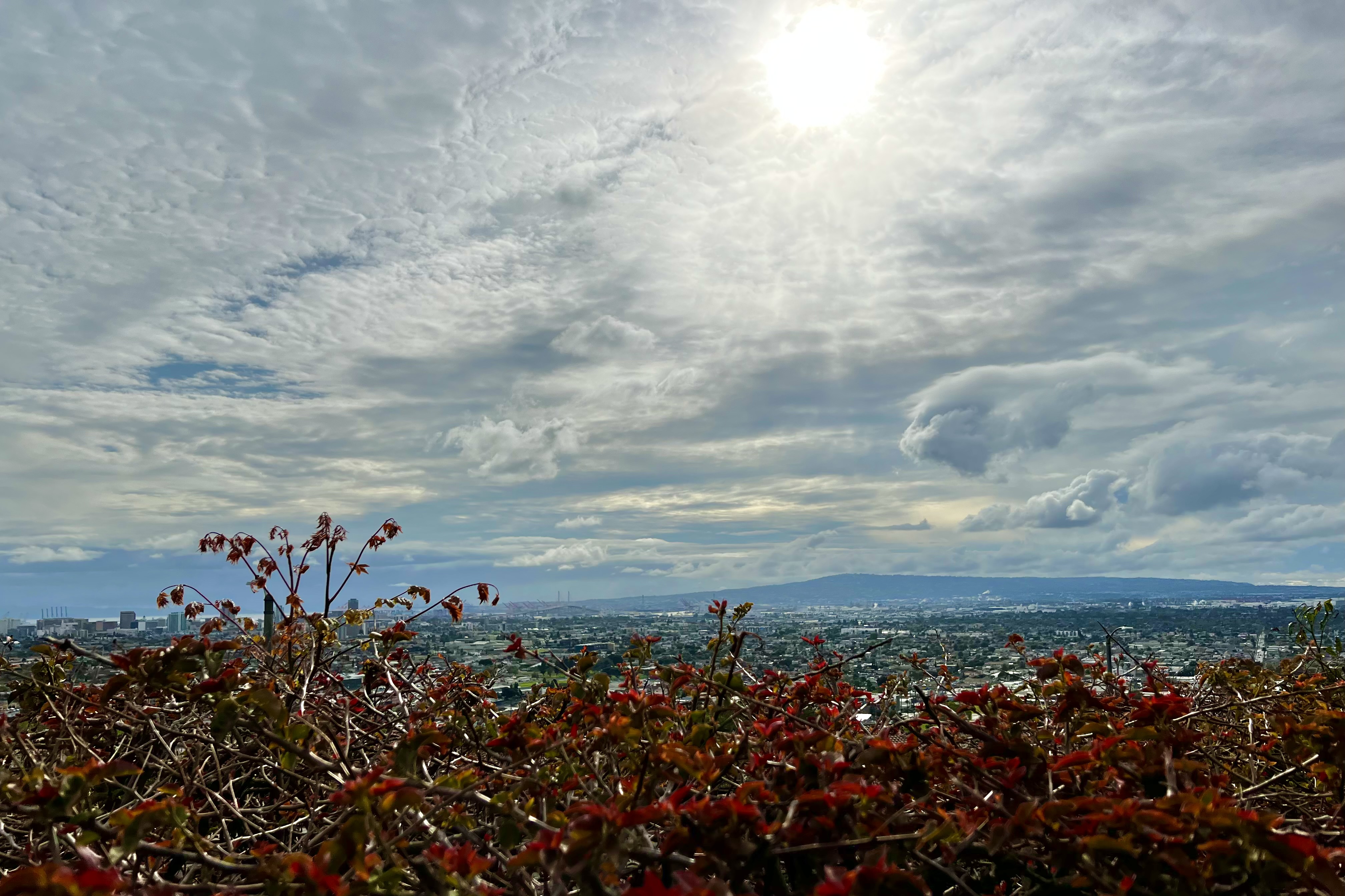 You can see the skyline of downtown LA, with the San Gabriel Mountains behind.. maybe some bit of the Santa Monica Mountains to the left (west).