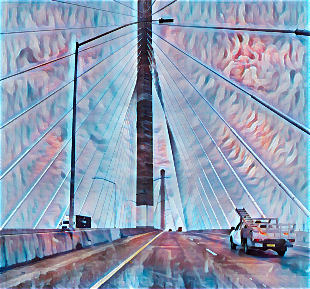 And over the new bridge down in the port, the one you cross just before the Vincent Thomas Bridge that takes you into San Pedro. Seems like we were watching its construction for years and years, and now it’s finally done, and it’s pretty cool. It was a grey shot, made blurry by rain, so I goofed around with it (using Prism):