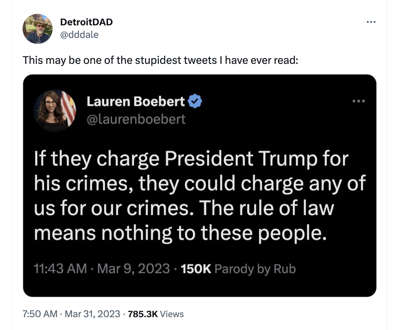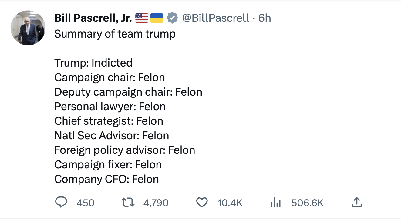 I tuned into CNN a few times today, and every time: BREATHLESS coverage of absolutely every millimeter of movement made by our newest little criminal. They covered the departure from his resort, the boarding of his plane in Florida, the landing in NYC, the motorcade making its way through the vacated streets of Manhattan (reminiscent of OJ’s Bronco), his arrival at his 5th Ave place. Jake Tapper was seriously peeved that they chose a helicopter angle for the 10 steps between his limo and the entrance because everyone wanted to see his face. Endless speculation about whether his body language suggested resignation.. he looked sober, he didn’t run his mouth, where was his usual defiance?! And then: will there be a mug shot, will there be a perp walk, what about cameras in the courtroom? Nobody has seen the sealed indictment, mind you, so nobody knows what the charges will be, but that hasn’t stopped anybody from their bloviations.