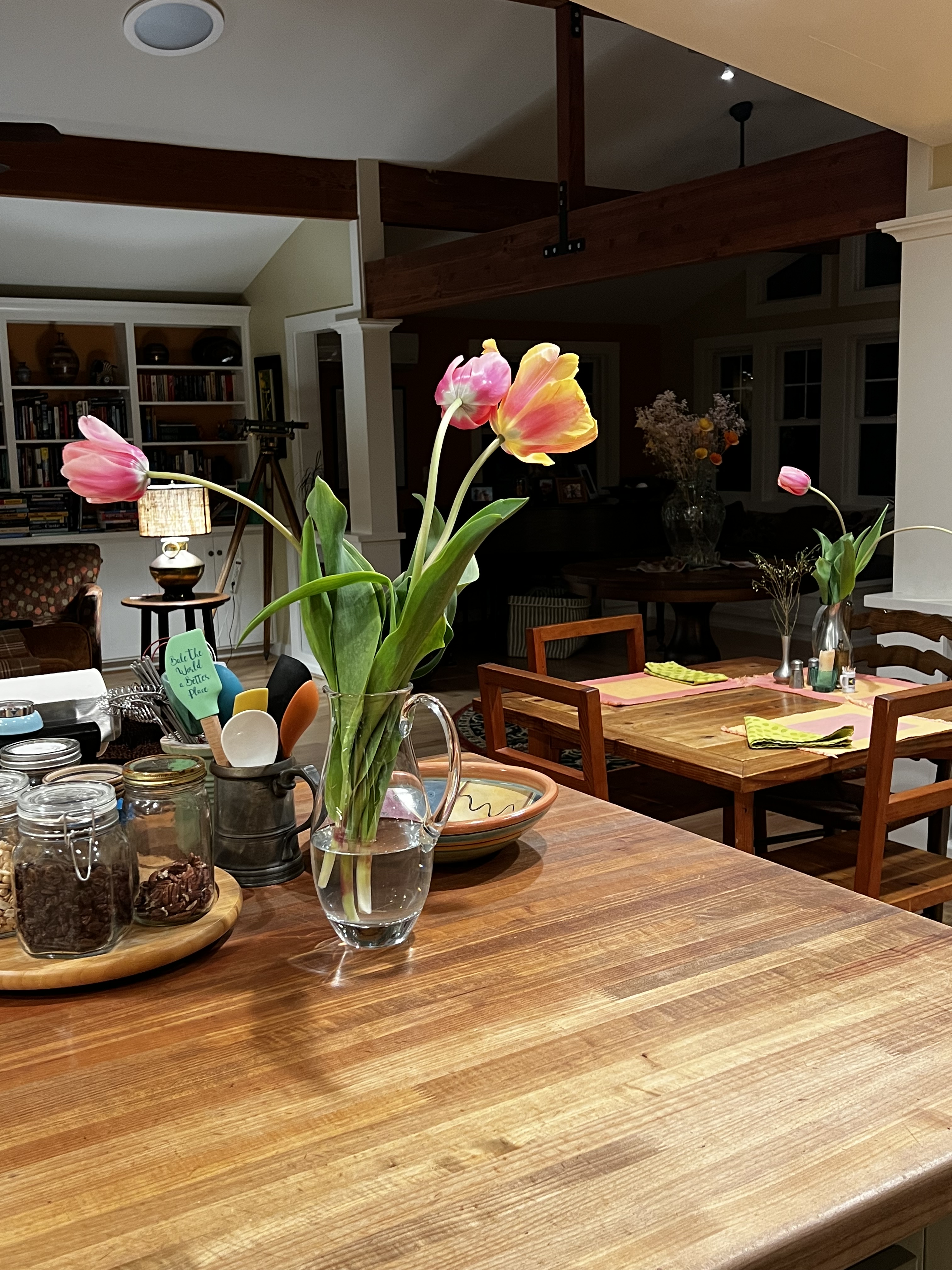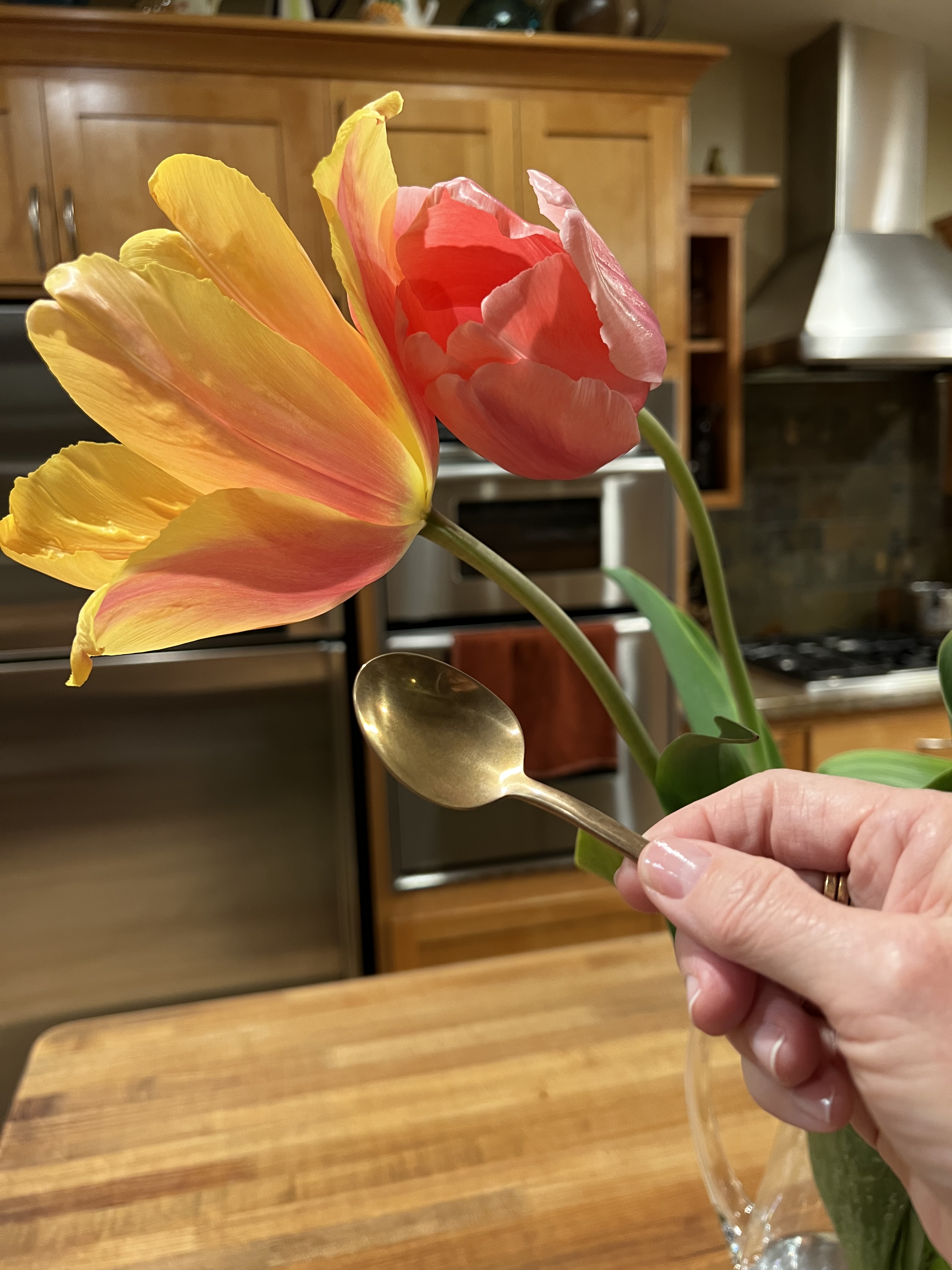 Here are a few shots of the ones currently on our kitchen island and dining table. I tried to capture the SIZE of the one… it is just huge, almost embarrassingly so. I got out a spoon for scale, but that didn’t really do it. Still… here are a few shots. Funnily, this batch of tulips is the same color as the ones in our yard. Which I may go get a picture of…