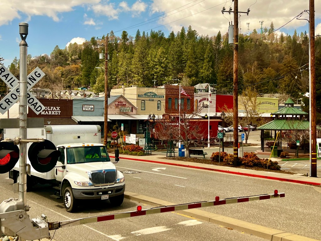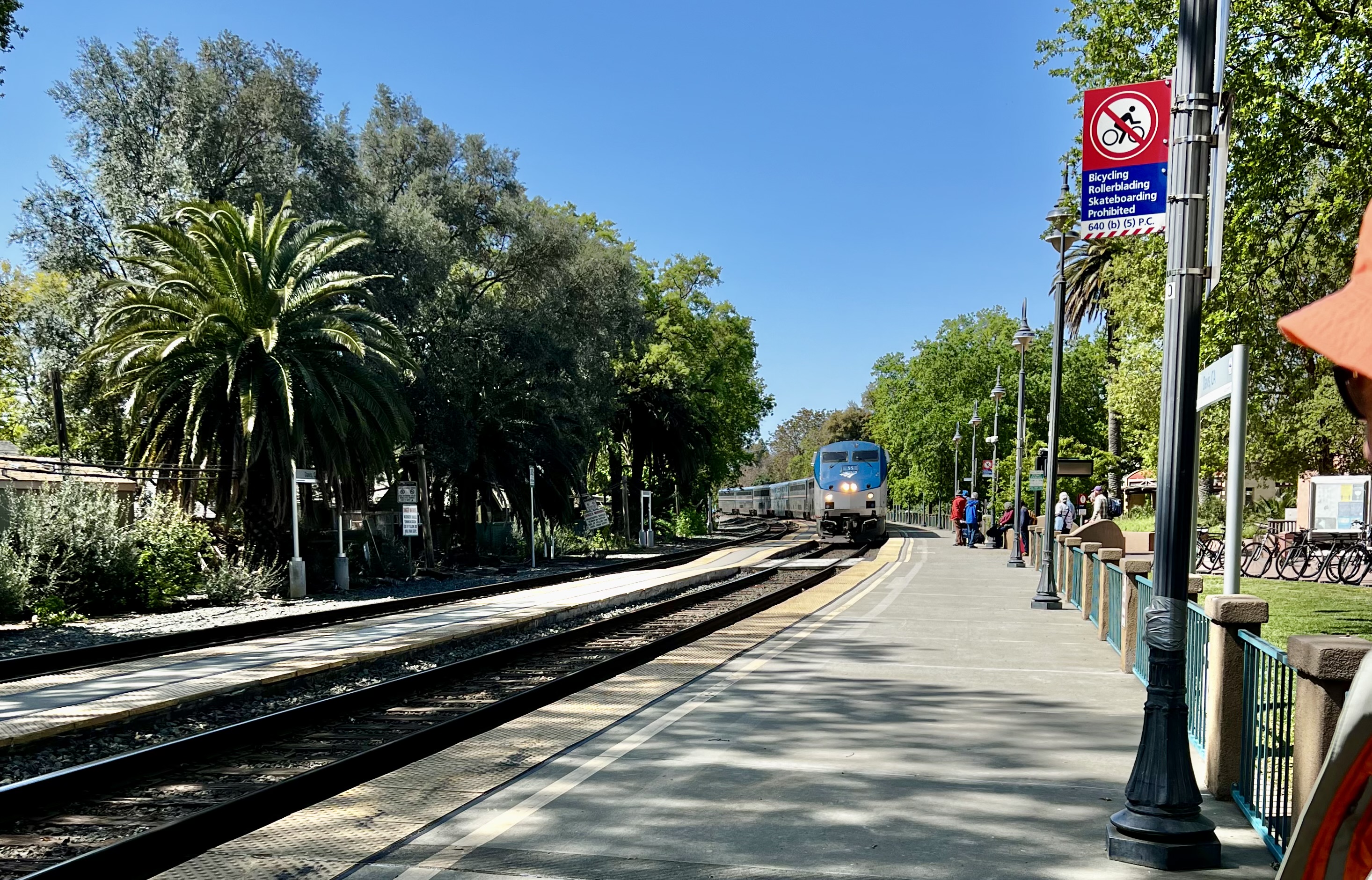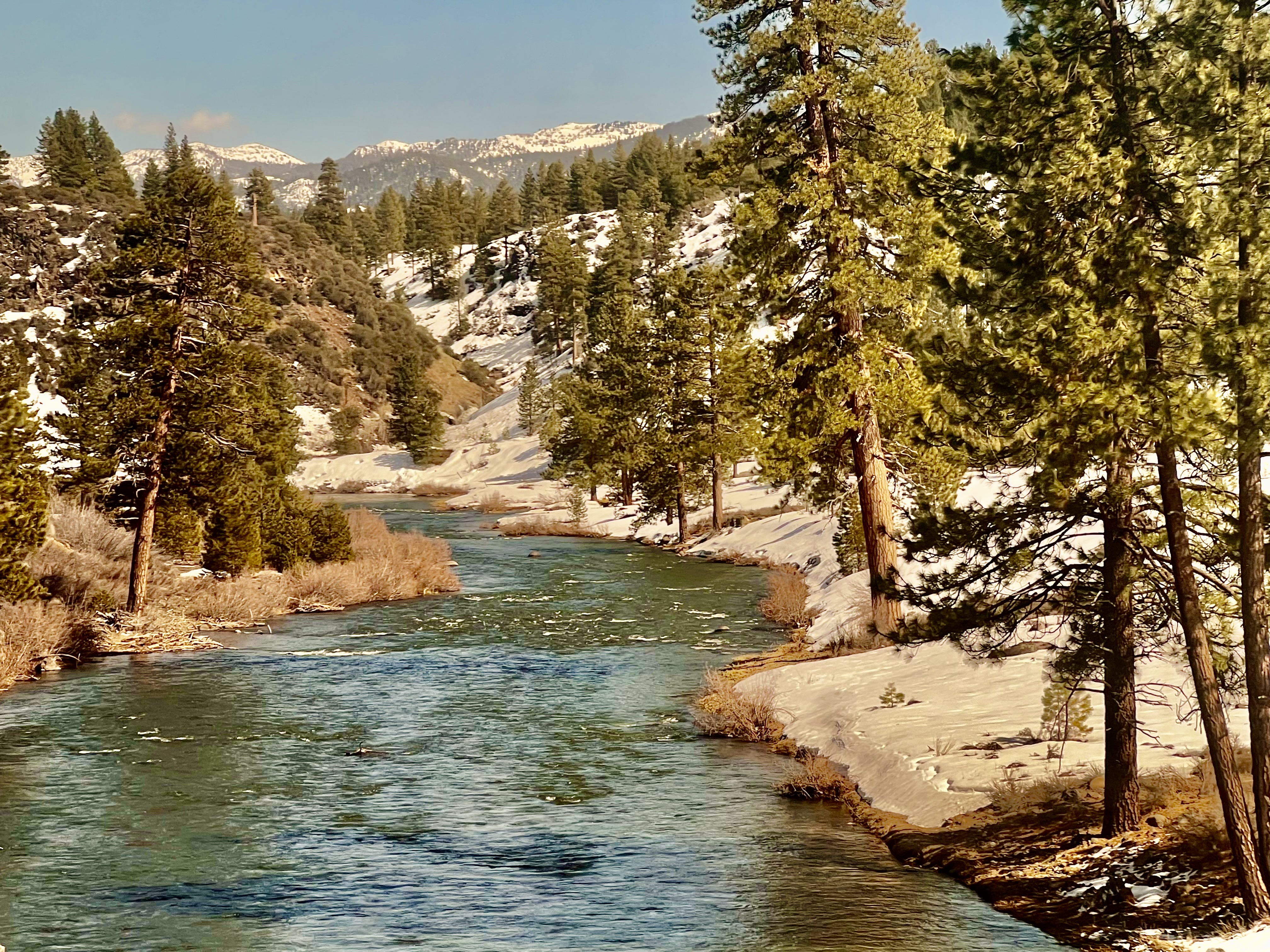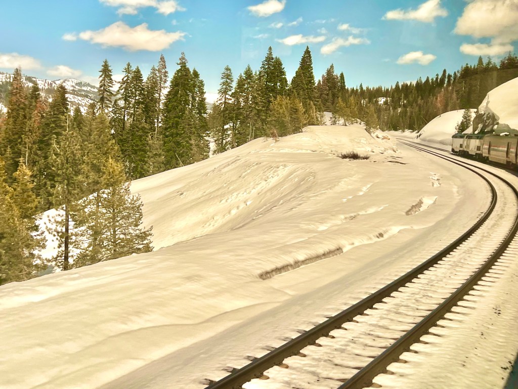 Donner Lake. And of note: we are cruising along the tracks visible (and seemingly covered in snow) last week when Jim and I were snowshoeing at Donner Summit. We asked a conductor about snow on the tracks and were told that the train moves slowly enough that it simply clears the tracks as it goes. Snow is typically light and fluffy, largely because the number of trains passing through precludes too much snow from settling and icing up. They have been known to stop the train and chisel snow as necessary.