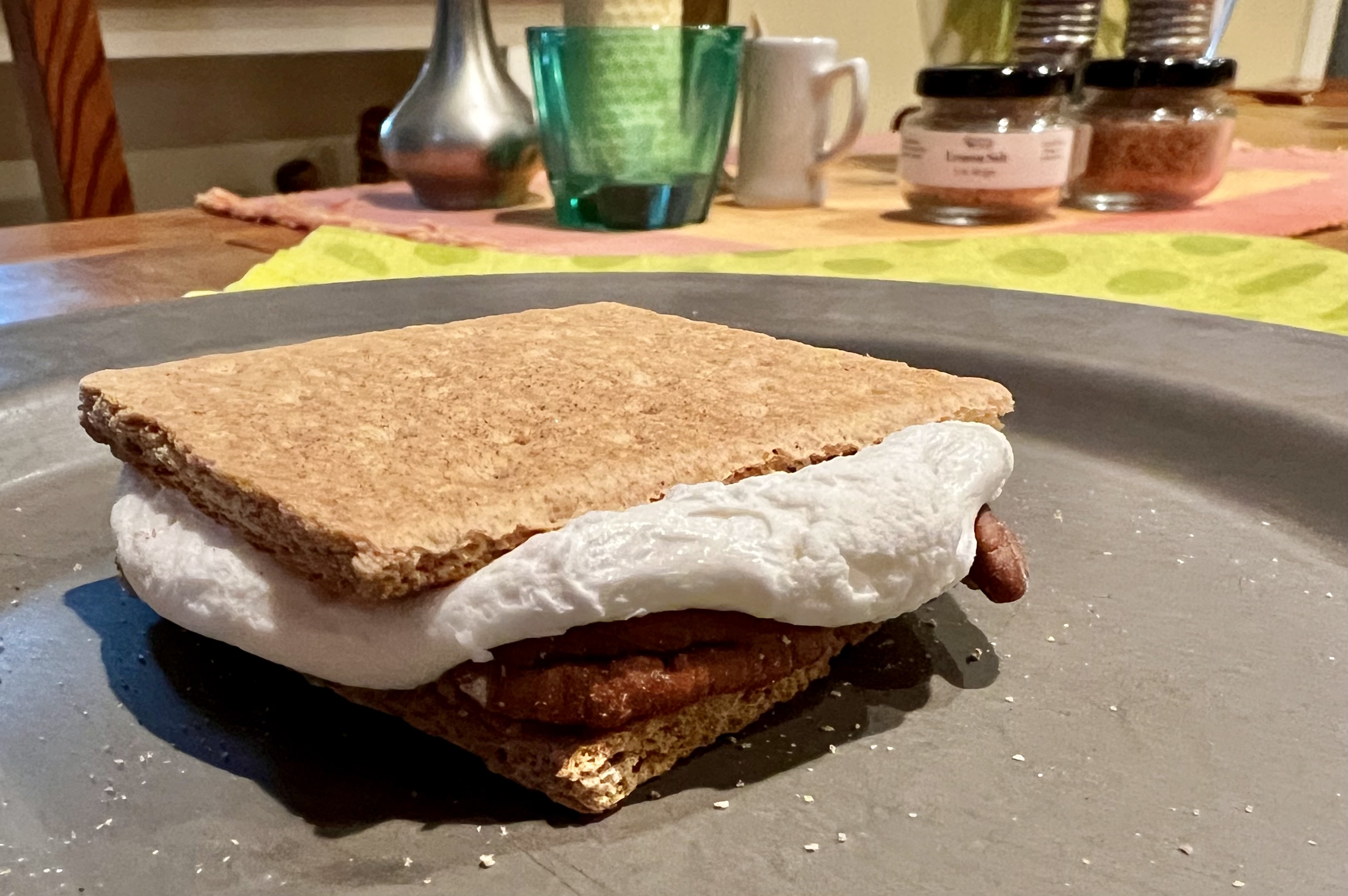Jim’s latest invention is a Pecan Dandy: graham crackers, a layer of roasted pecans and a bunch of dandies (the brand of marshmallows we’ve been addicted to for the last few years). Put it in the microwave for a few seconds.