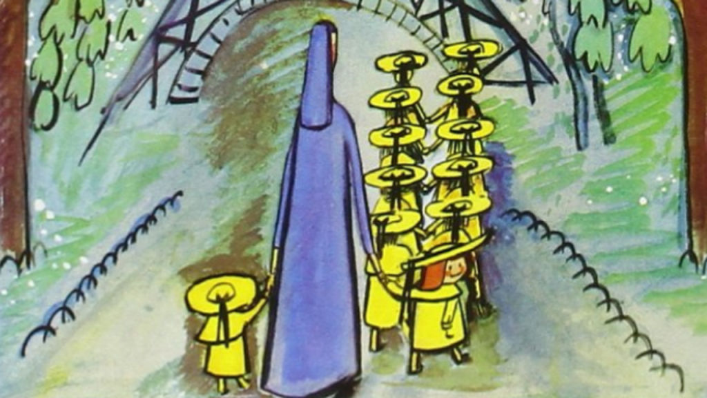 The scene reminded me of one of my favorite childhood books.. Madeline. Madeline is one of twelve young girls in a boarding school (orphanage?) led around by a nun.