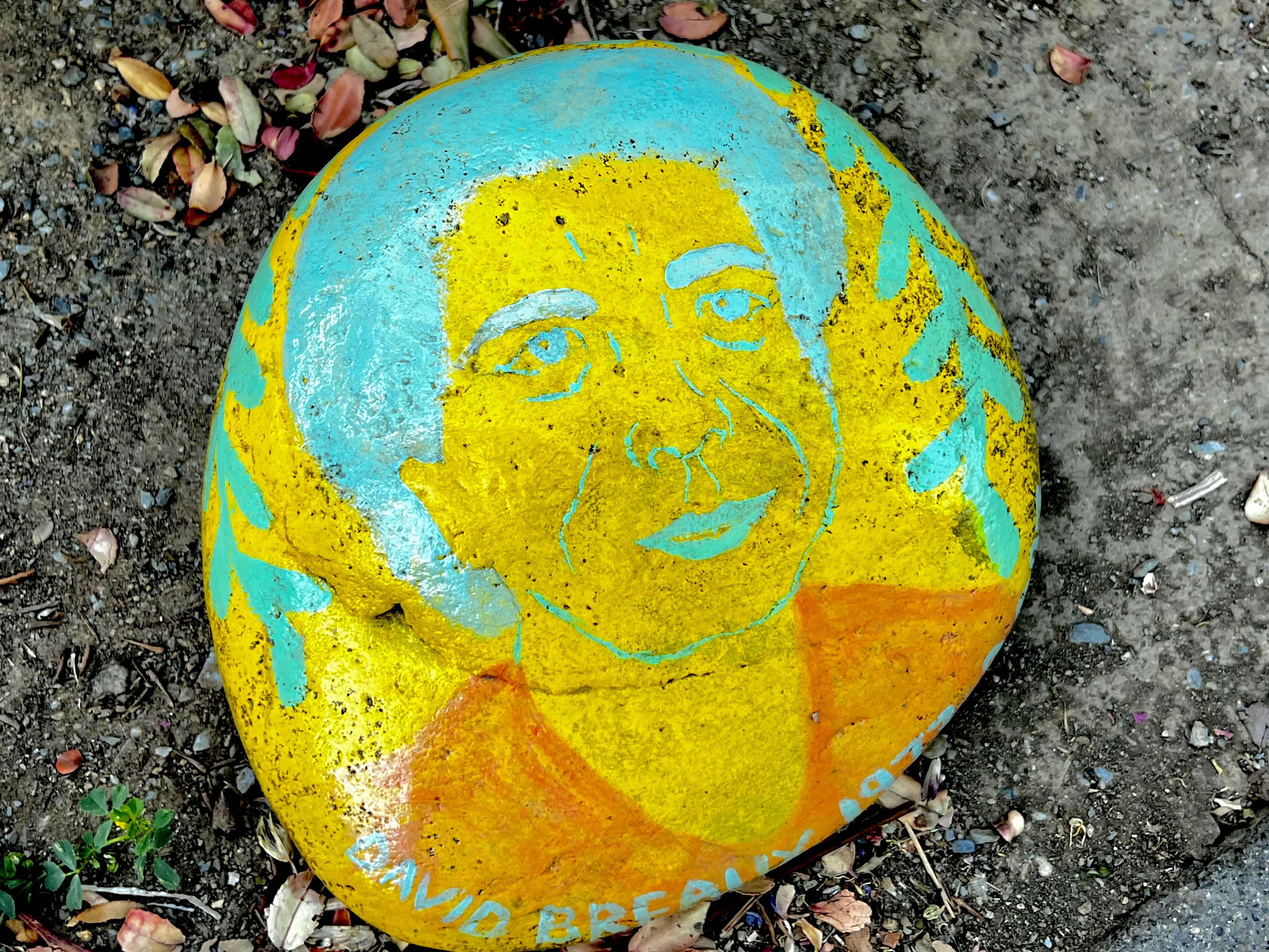 [Note: the picture at the top is a rock painted with David’s image that sits besides the bench… very nice!]