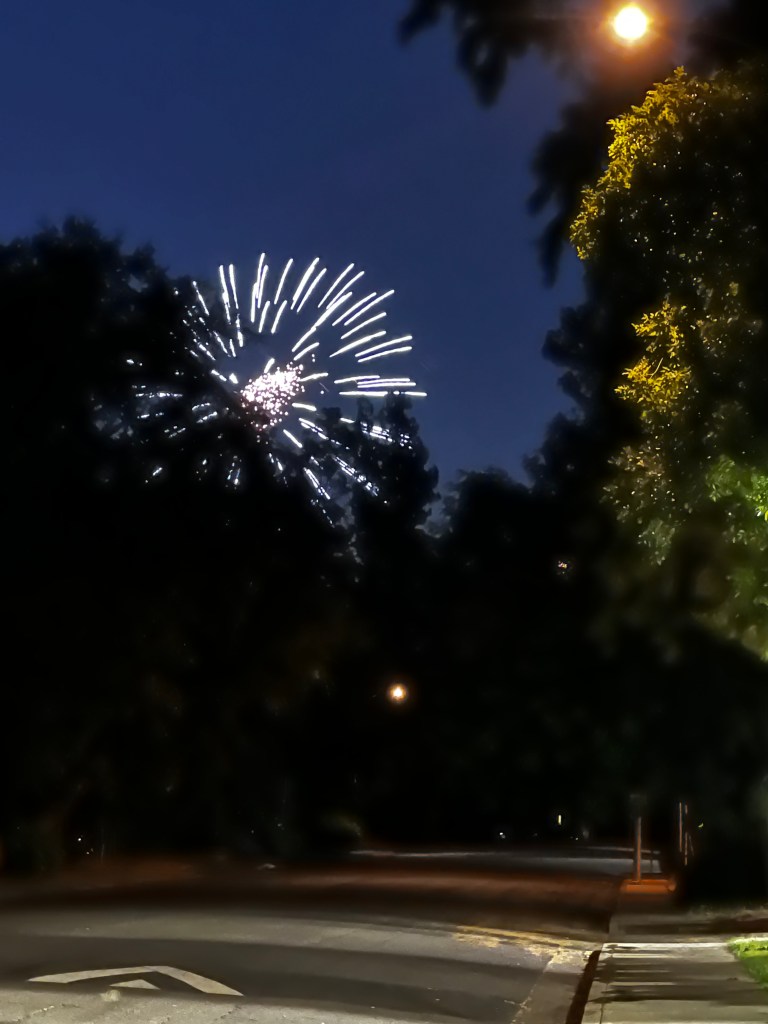 We got home just in time to hear the fireworks start up in Community Park. No time to get up there (or interest, really), but standing in the middle of A Street, I could catch a few of them: