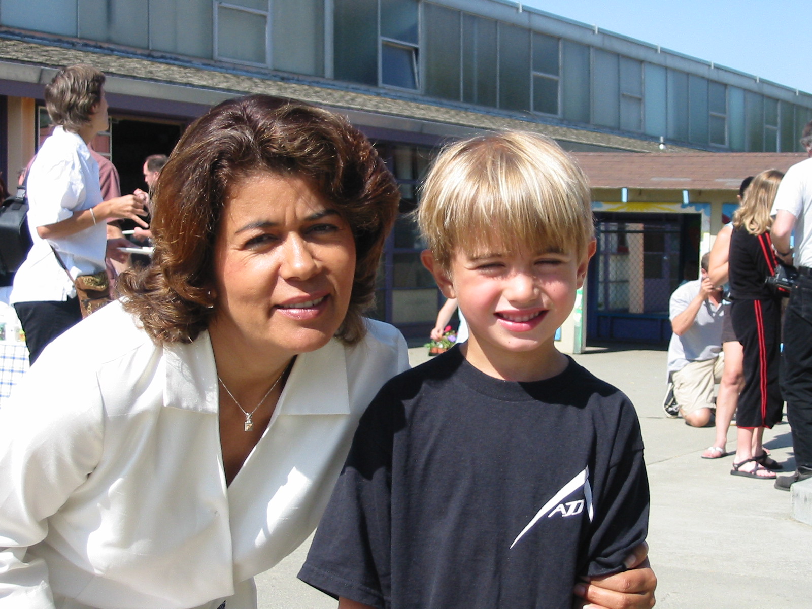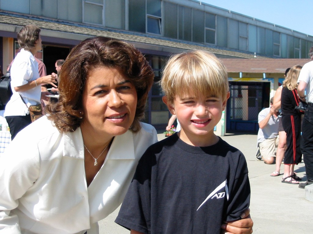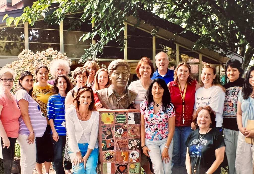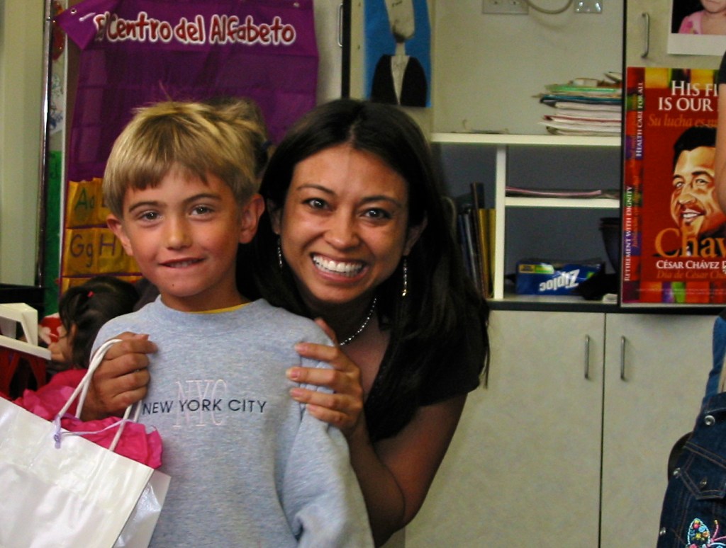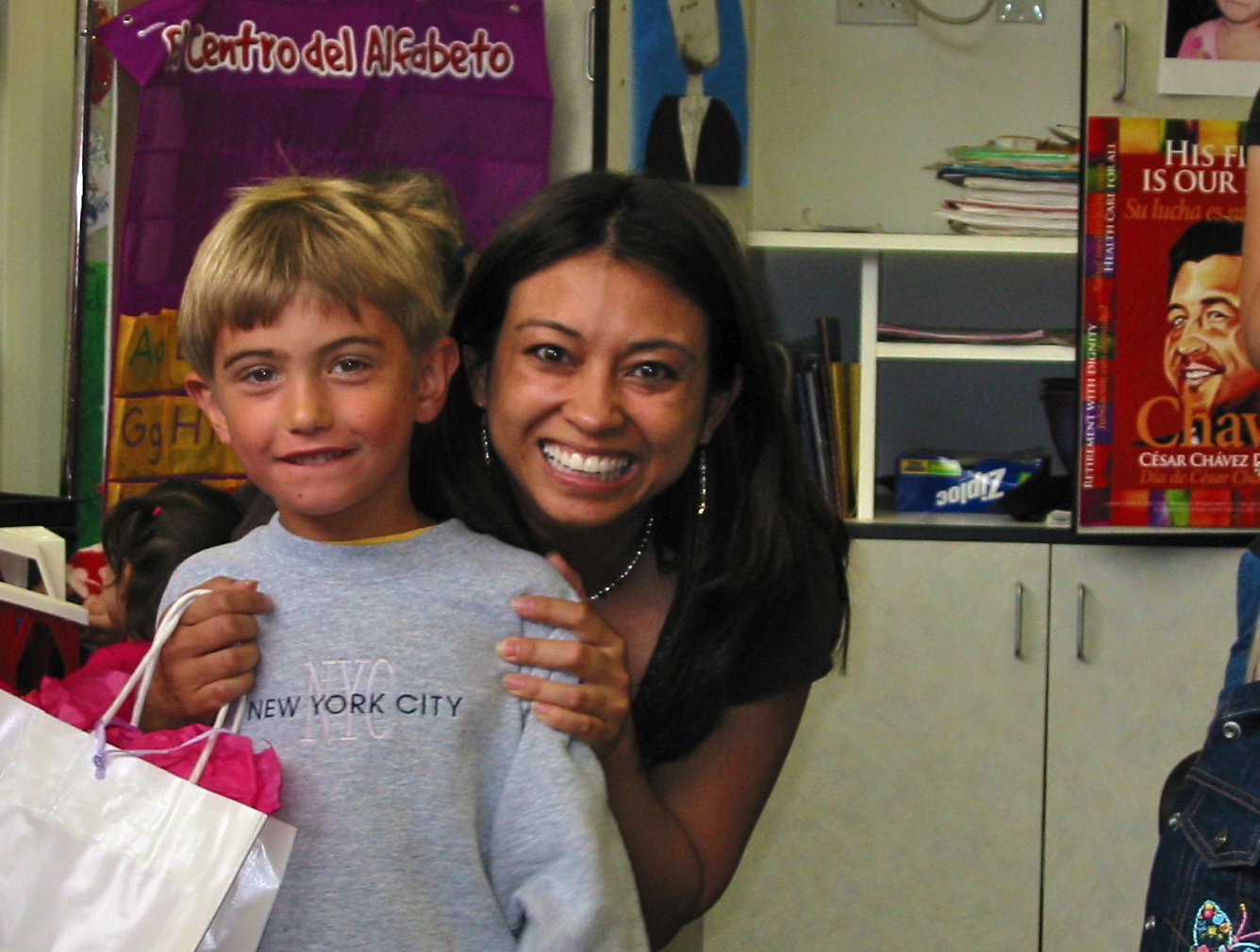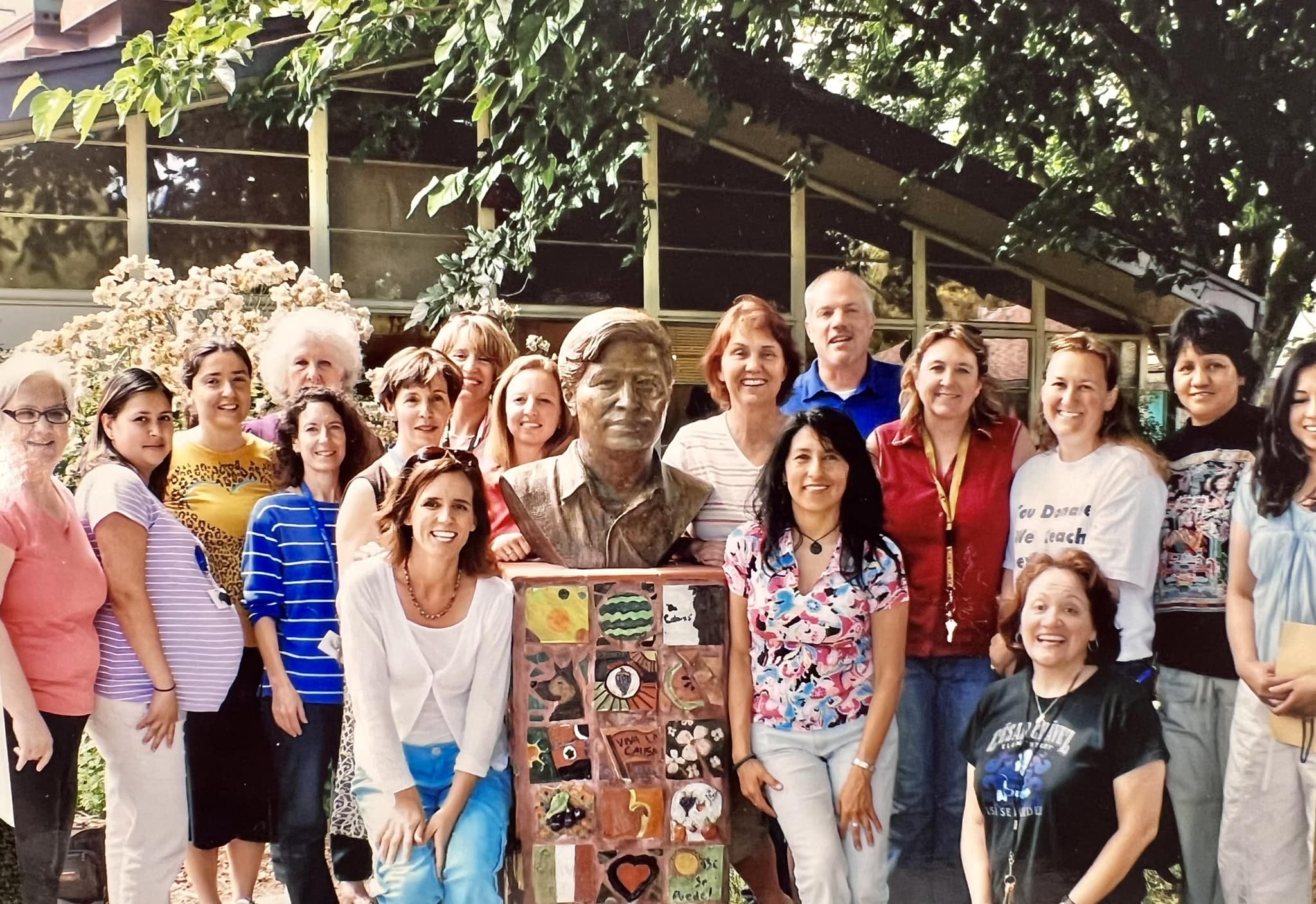 The photo includes Senora Bugsch (first grade.. almost out of the photo on the right side), Senora Dunbar (second grade, white tee shirt with lettering, who taught with Senora [hmmm], not pictured), Senora Peavyhouse (I think) (sixth grade, on Chavez’s right shoulder), principal Senora Beck (far left).. and numerous other teachers he didn’t have. I don’t see Peter’s kindergarten teacher (Senora Gutierrez), nor his second grade teacher (Senorita Cruz), nor his fourth grade teacher (Senorita Marchand), nor his fifth grade teacher (Senora Ponce). I can’t imagine they’d all moved on.. but nor can I imagine the photo includes the entire teacher community at Chavez!