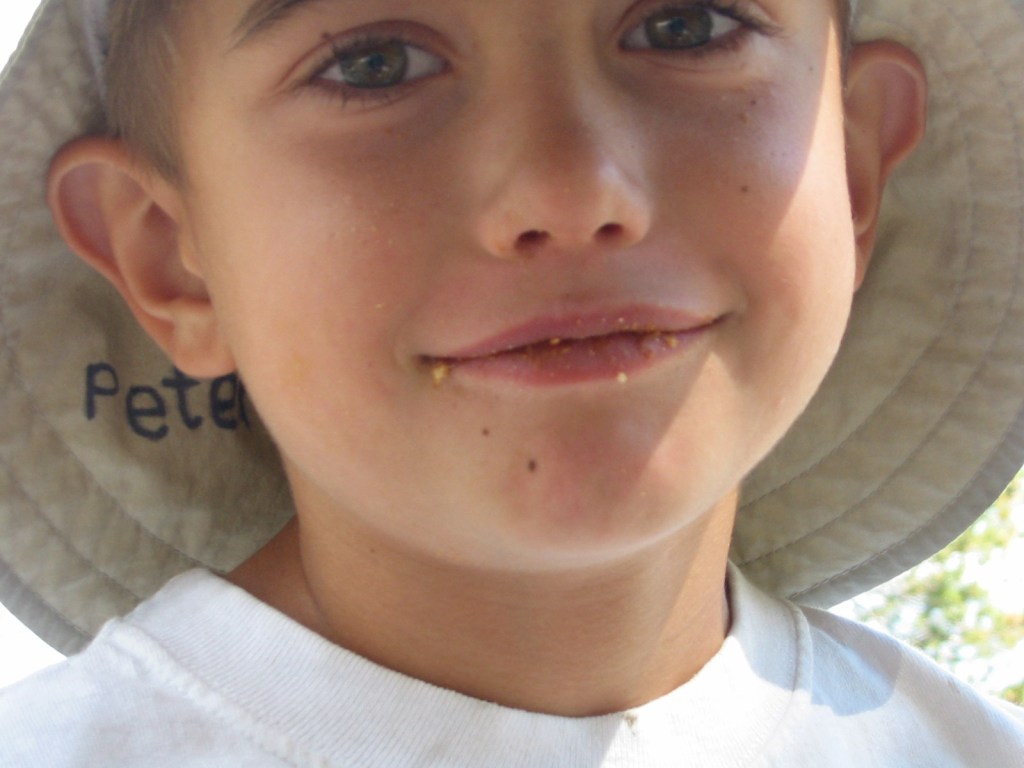 This is a photo I came across today, as well… it’s a photo taken in the summer following first grade.. and it really got me. The crumbs, yes, the eyelid freckle and the fold of the ears.. but I really smiled at his name inscribed (by him) on the inside of this hat. I could stare at this photo for hours.