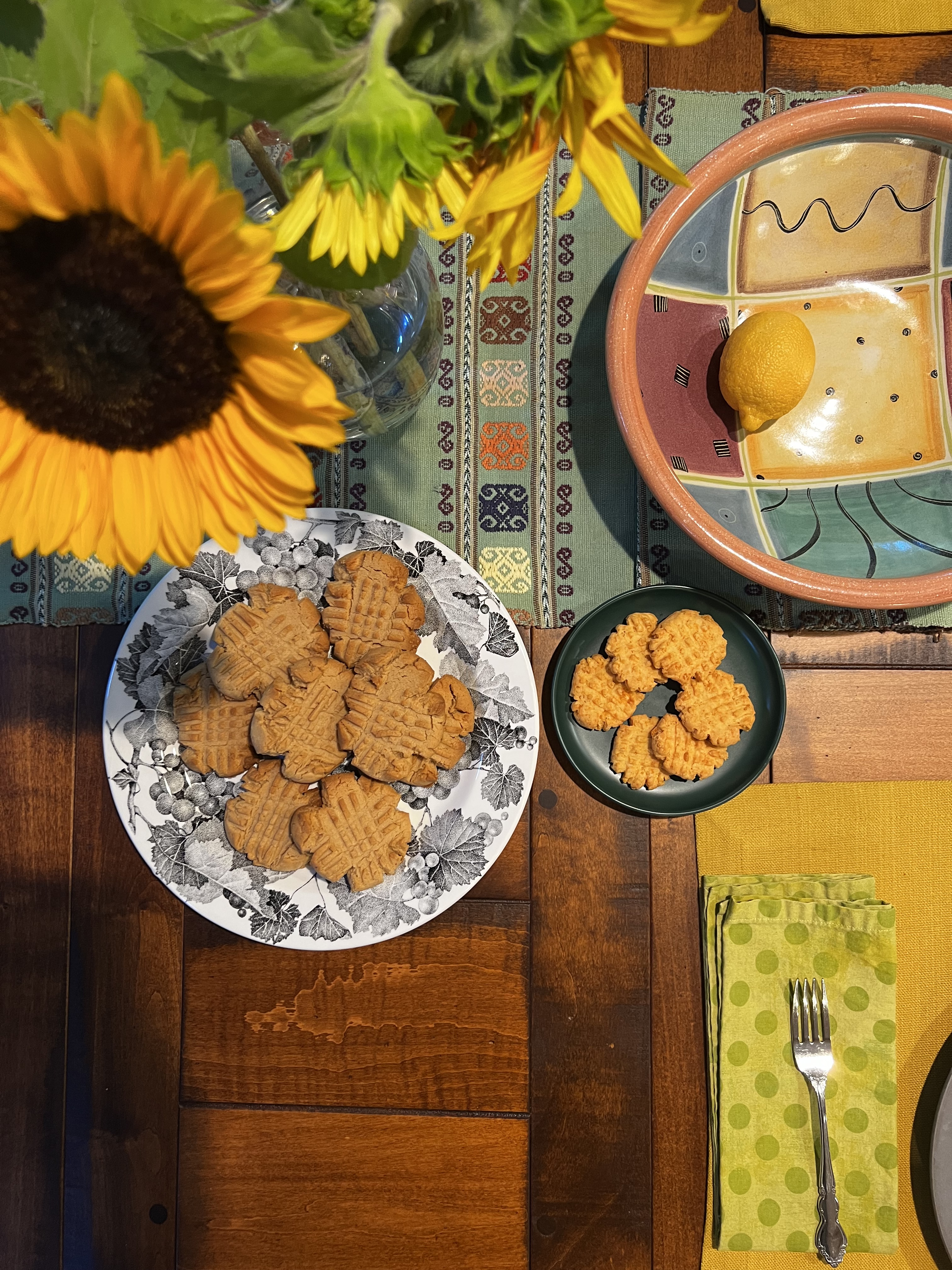 But it’s the dessert and appetizer — pictured above — that I’m getting a kick out of. I made cheese crackers (one of my favorite things to eat) for an event I attended last night and I had squirreled away a few for us, so we started with those. Jim decided to make some peanut butter cookies for dessert, which was kind of a serendipitous choice, as he maybe didn’t know I’d be serving the cheese crackers and .. well… they look like bigger/smaller versions of each other.