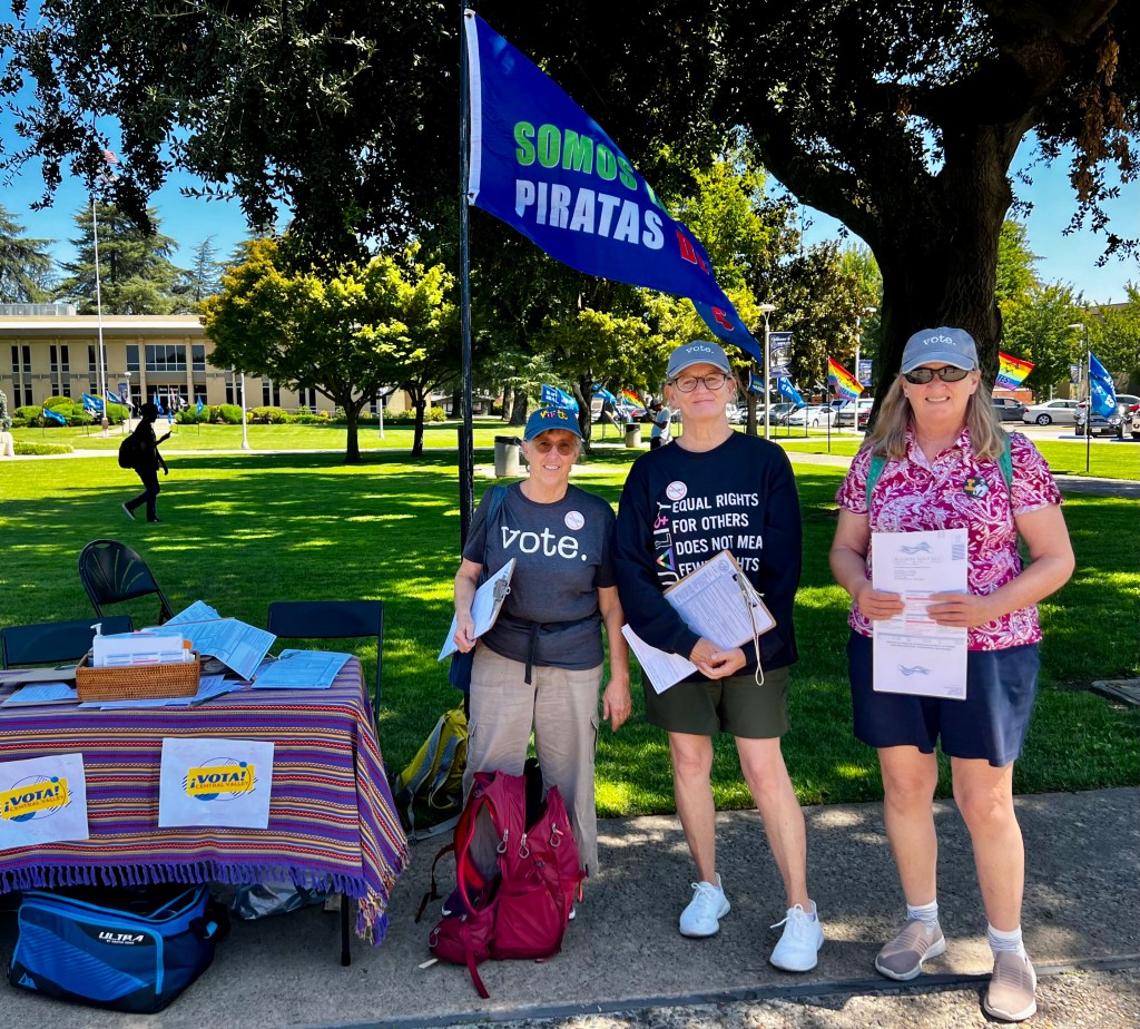 Three of us came from Davis (others from the Bay Area!). Our Davis trio was Linda, Nancy and me. Each of us registered 9 voters. That a 90-minute drive each way, and 3-ish hours of wandering around campus looking for victims (er.. unregistered students). We met in Davis at 8:30 and got home at 4:30.. so there was fluff time in there (lunch, training). It’s a lot of time, and I’m pooped. But again… it’s productive.