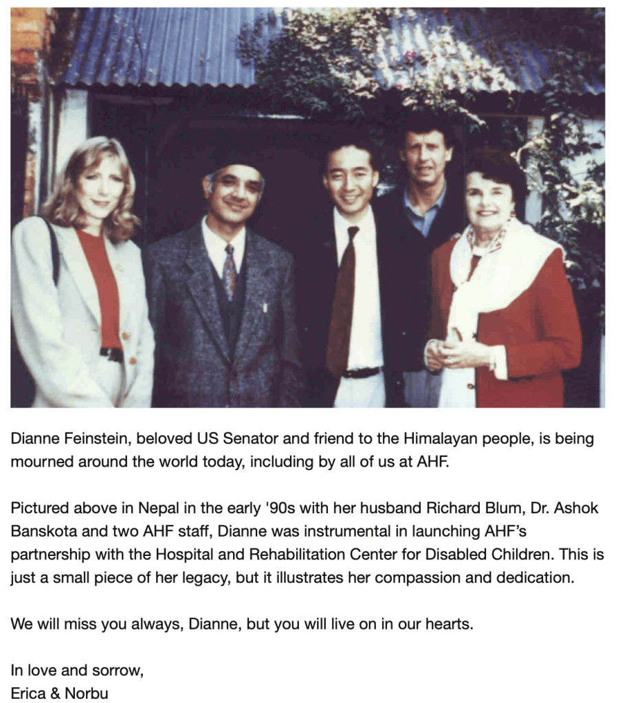 I like this little tiny factoid: she was a supporter of the Nepalese people, through an organization her husband Richard Blum founded, The American Himalayan Foundation. I didn’t know about this before I trekked in Nepal, but imagine my huge surprise and delight when in a tiny, remote teahouse* high in the Himalayas, I saw photos of both Dianne Feinstein and Bill Clinton, photos taken on a shared trip to the Kumbu (a region at the base of Mt. Everest, inaccessible to cars). I’m like, I KNOW THOSE FOLKS! Which… as a Californian/American traveling in such a remote place, surrounded by Nepalese folks who could not possibly have related, they were like my people. Funny.