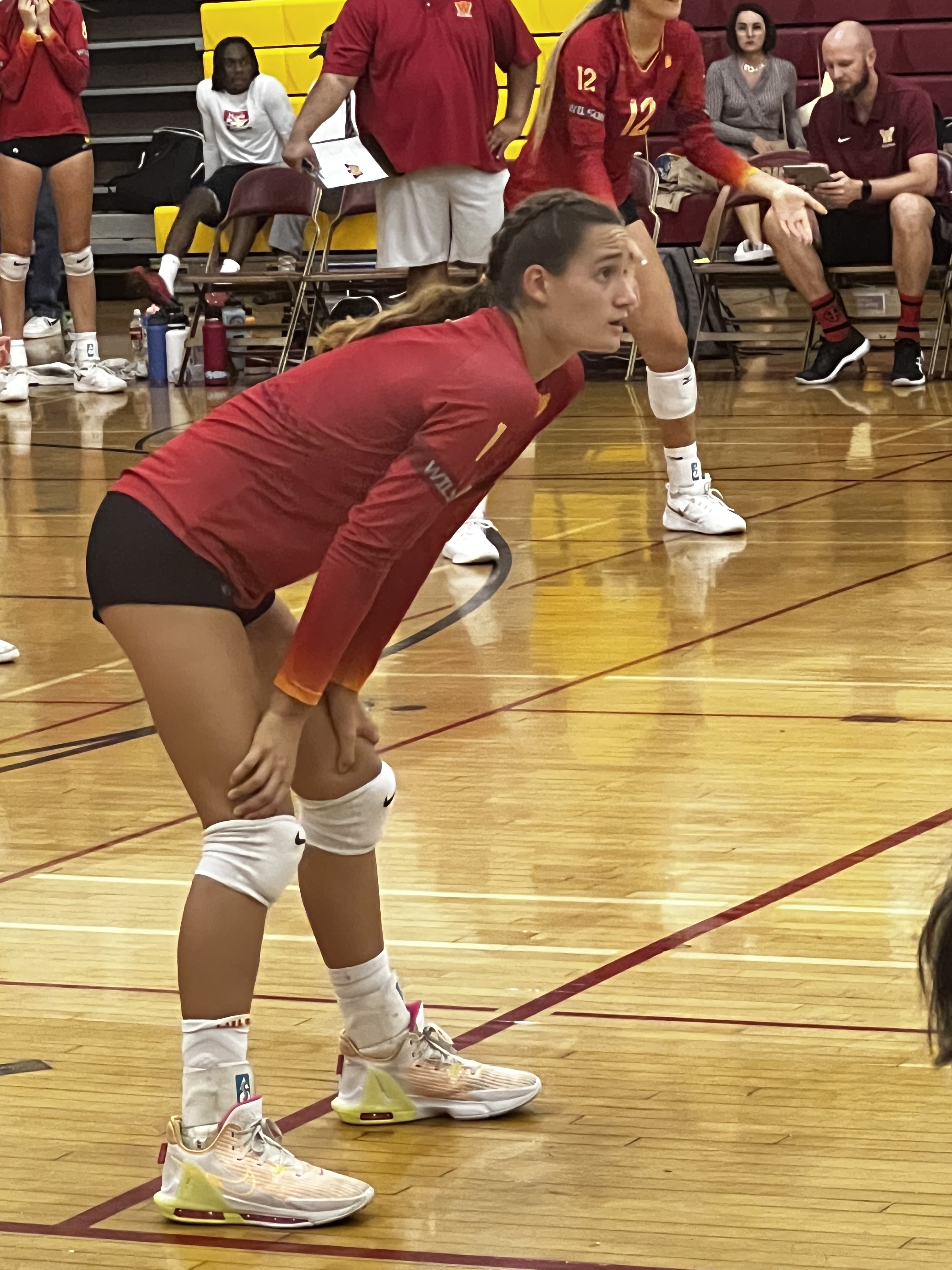 Ready position. Once the ball’s in play, Courtney takes her position up at the net. Mostly she blocks, but she also gets the ball a bunch for point winning kill shots. Super fun to watch.