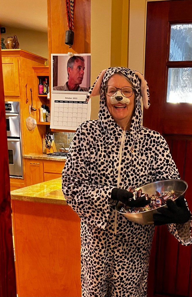 The Dalmatian suit that Michael made for me (and 8 other would-be Dalmatians) six years ago so we could all parade around in West Hollywood on Halloween (a thing) dressed as Cruella Deville and her 9 Dalmatians, came in handy today!