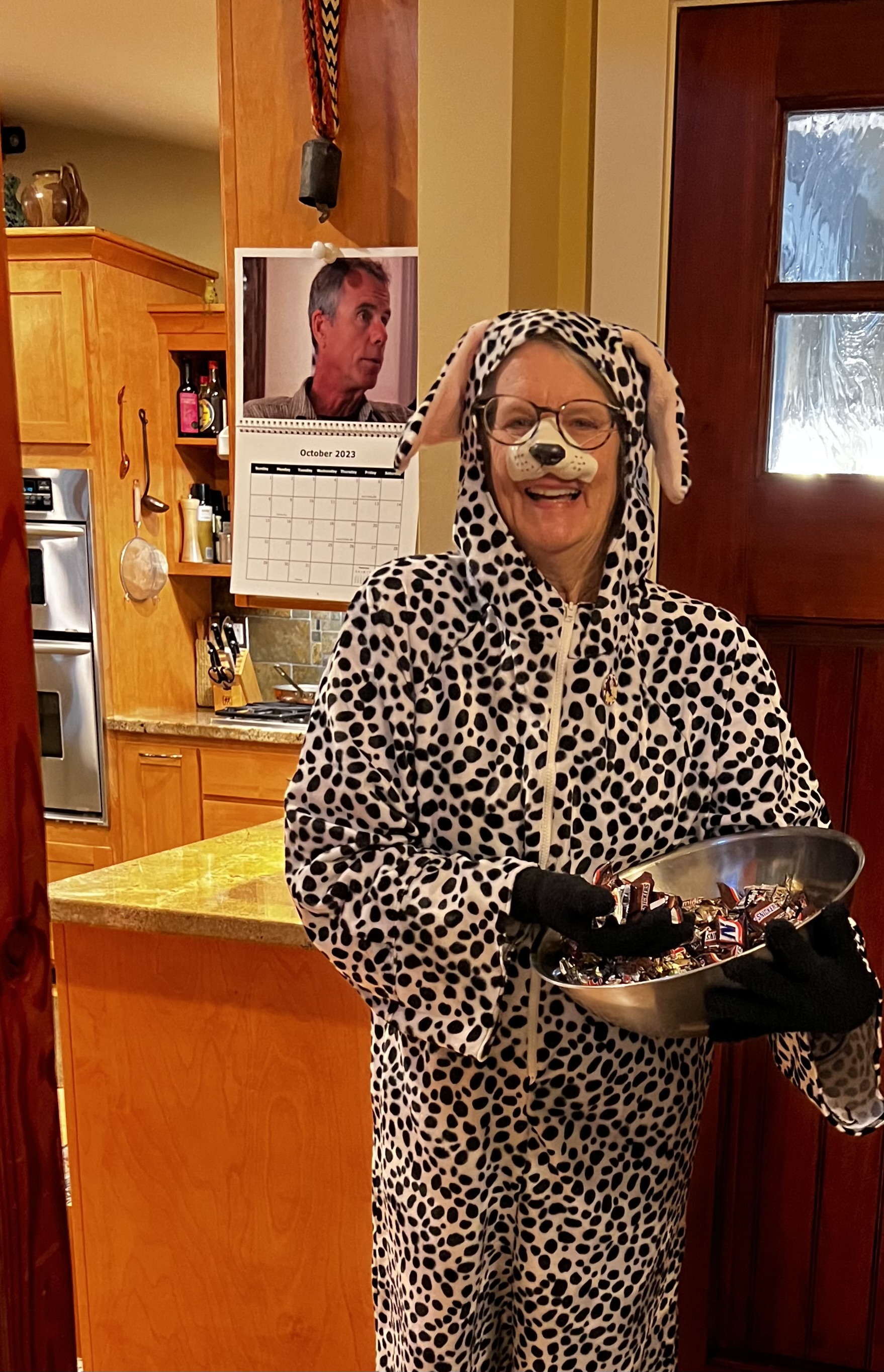 The Dalmatian suit that Michael made for me (and 8 other would-be Dalmatians) six years ago so we could all parade around in West Hollywood on Halloween (a thing) dressed as Cruella Deville and her 9 Dalmatians, came in handy today!